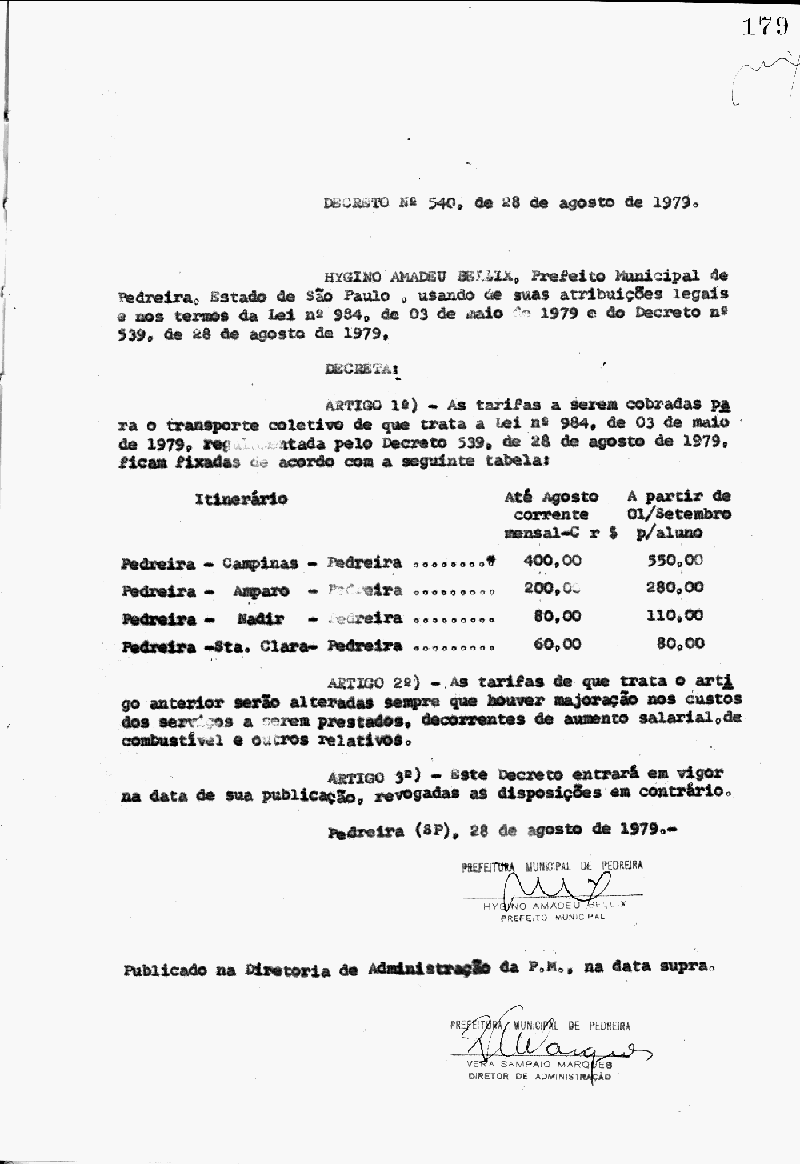 Ementa: Artigo 1° - As tarifas a serem cobradas para o transporte coletivo de que trata a Lei n°984, de 03 de maio de 1979, regulamentada pelo decreto 539, de 28 de agosto de 1979, ficam fixadas de acordo com a seguinte tabela