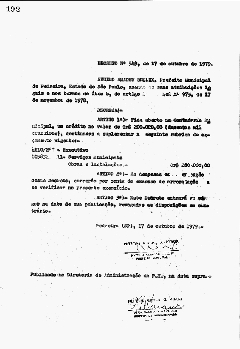 Ementa: Artigo 1° - Fica aberto na Contadoria Municipal, um crédito no valor de Cr$ 200.000,00 (duzentos mil cruzeiros), destinados a suplementar as seguintes rubricas do orçamento vigente