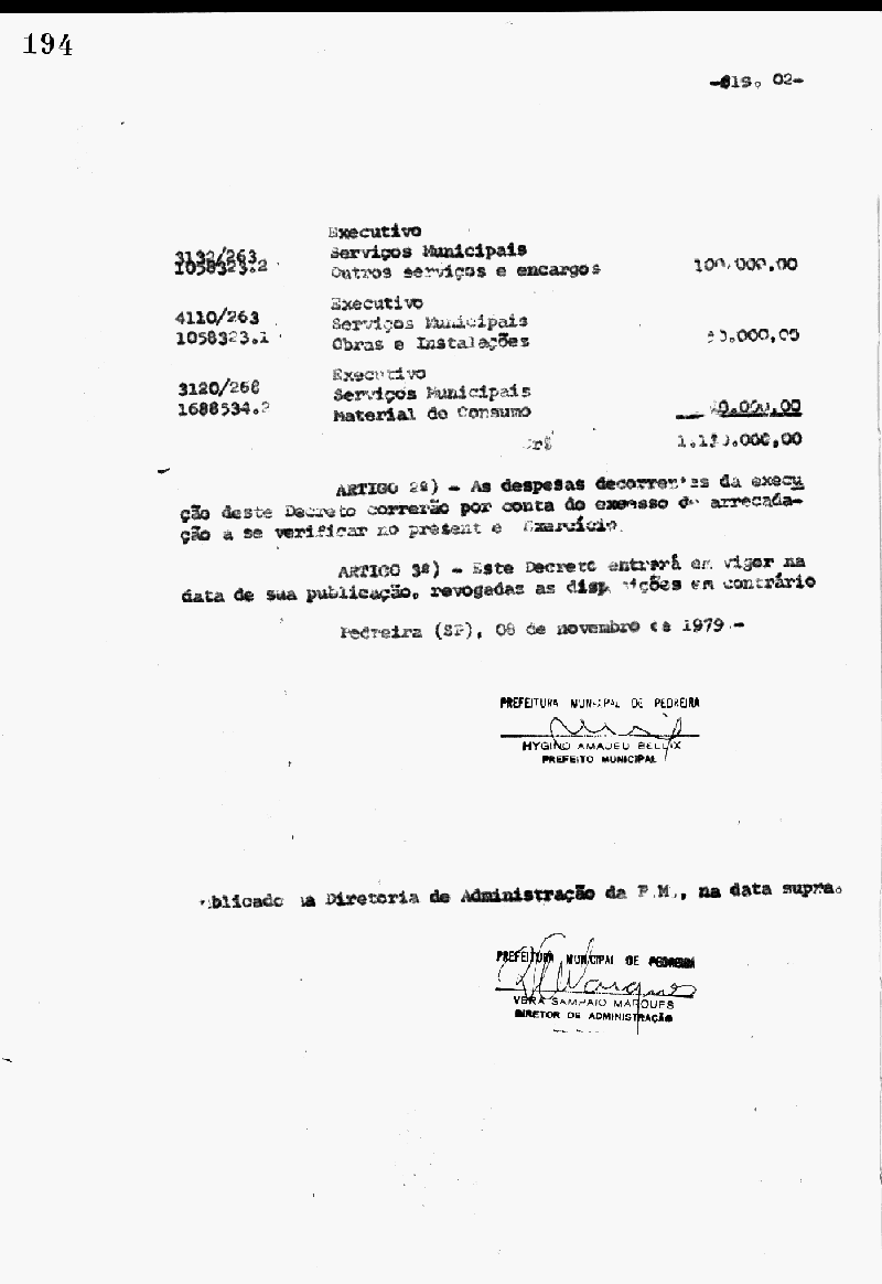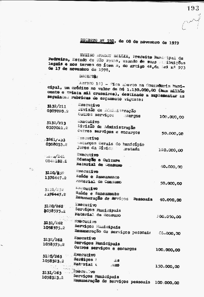 Ementa: Artigo 1° - Fica aberto na Contadoria Municipal, um crédito no valor de Cr$ 1.130.000,00 (um milhão e cento e trinta mil cruzeiros), destinados a suplementar as seguintes rubricas do orçamento vigente
