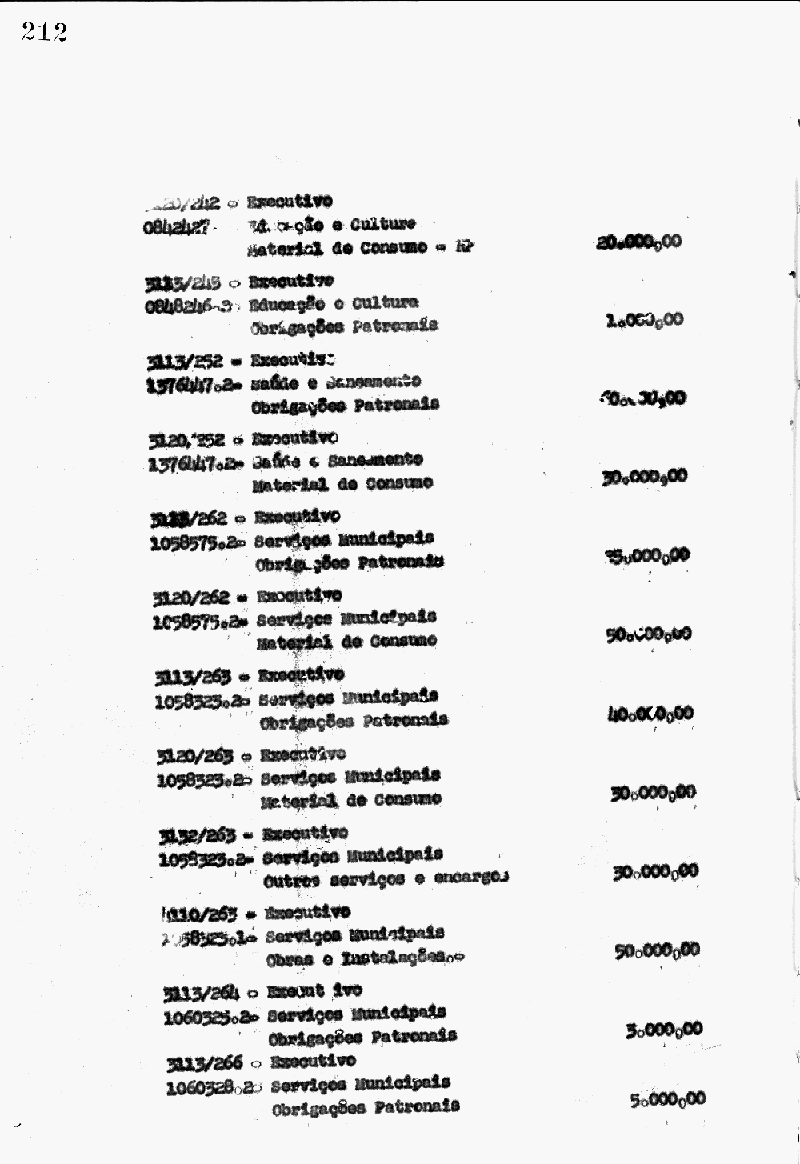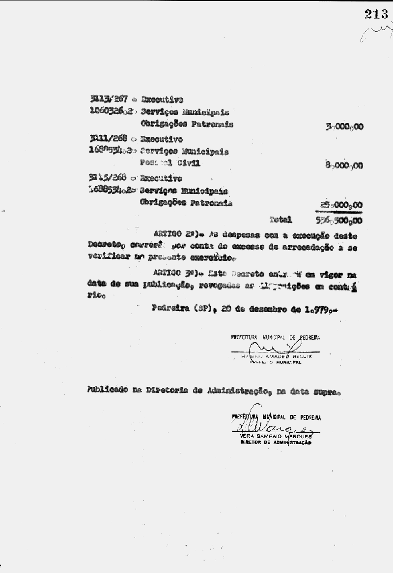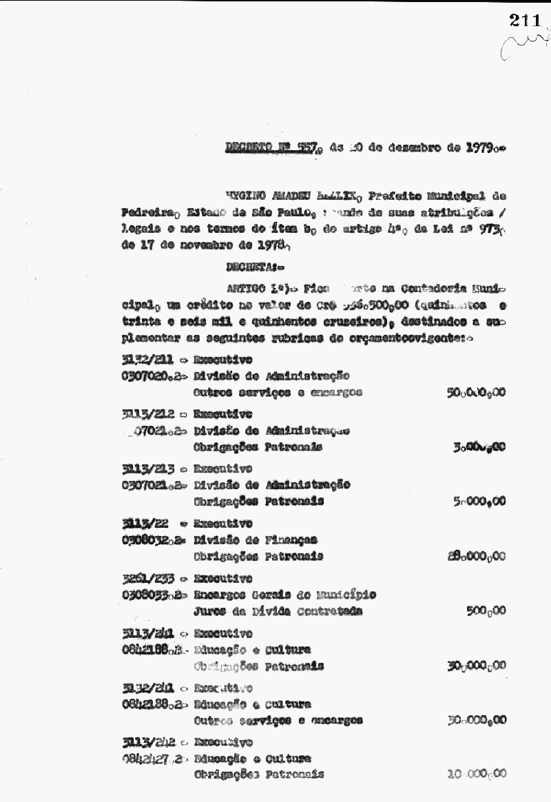 Ementa: Artigo 1° - Fica aberto na Contadoria Municipal, um crédito no valor de Cr$ 536.500,00 (quinhentos e trinta e seis mil e quinhentos cruzeiros), destinados a suplementar as seguintes rubricas do orçamento vigente