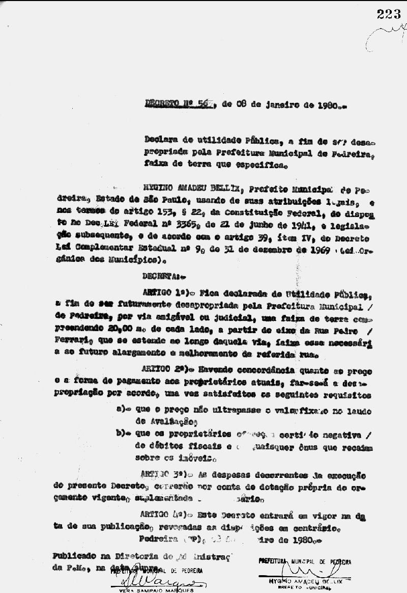 Ementa: Declara de Utilidade pública, a fim de ser desapropriada pela Prefeitura Municipal de Pedreira, faixa de terra que especifica