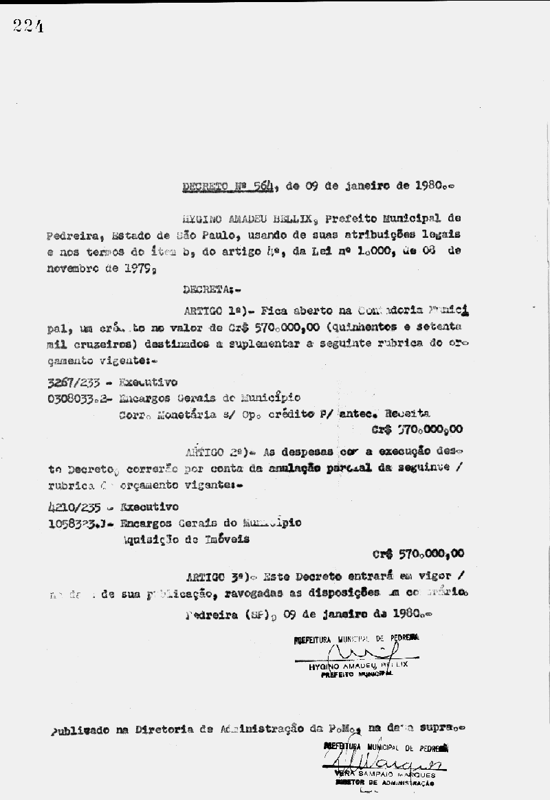 Ementa: Artigo 1° - Fica aberto na Contadoria Municipal, um crédito no valor de Cr$ 570.000,00 (quinhentos e setenta mil cruzeiros), destinados a suplementar as seguintes rubricas do orçamento vigente