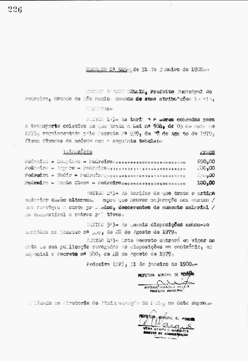 Ementa: Artigo 1° - As tarifas a serem cobradas para o transporte coletivo de que trata a lei n° 984, de 03 de maio de 1979, regulamentado pelo decerto n° 539