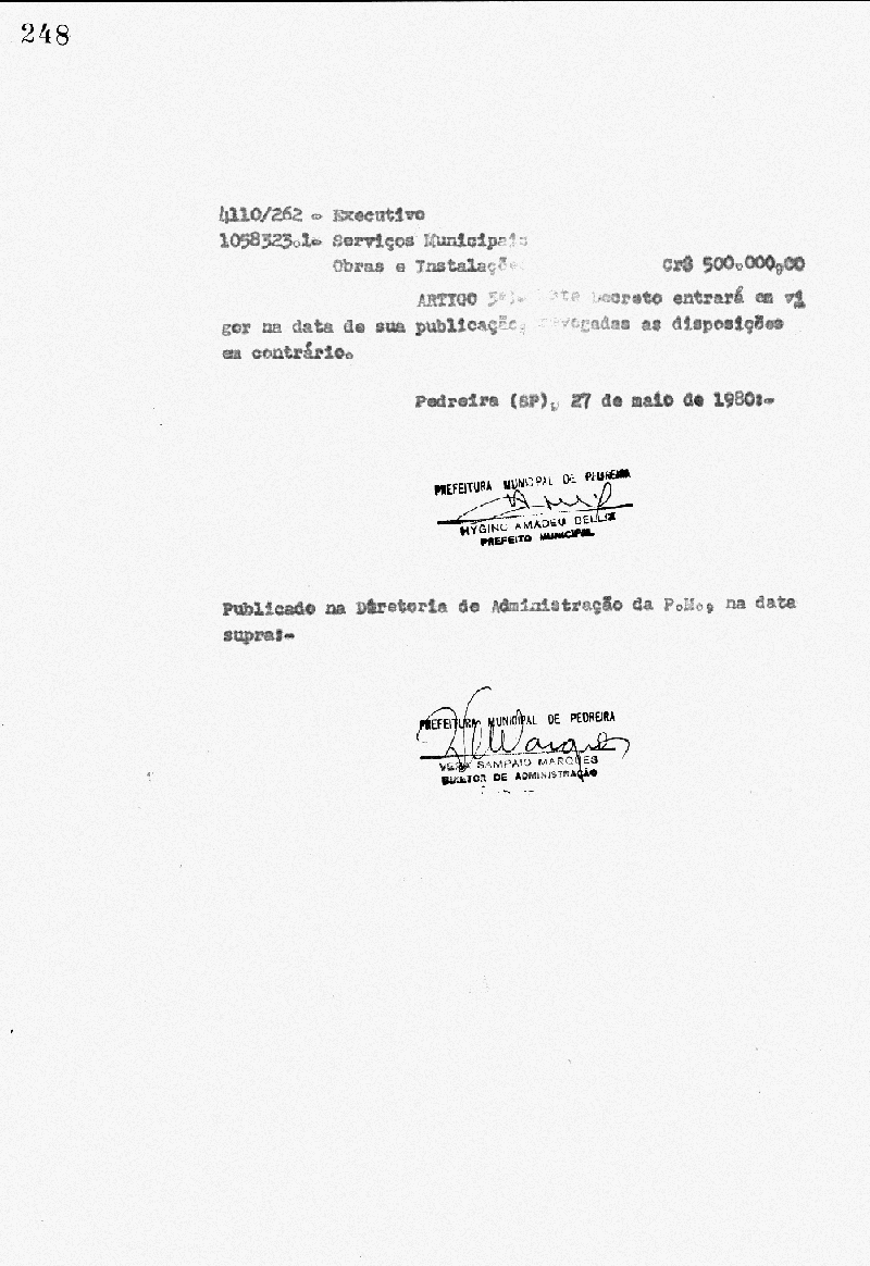 Ementa: Artigo 1° - Fica aberto na Contadoria Municipal, um crédito no valor de Cr$ 500.000,00 (quinhentos mil cruzeiros), destinados a suplementar as seguintes rubricas do orçamento vigente