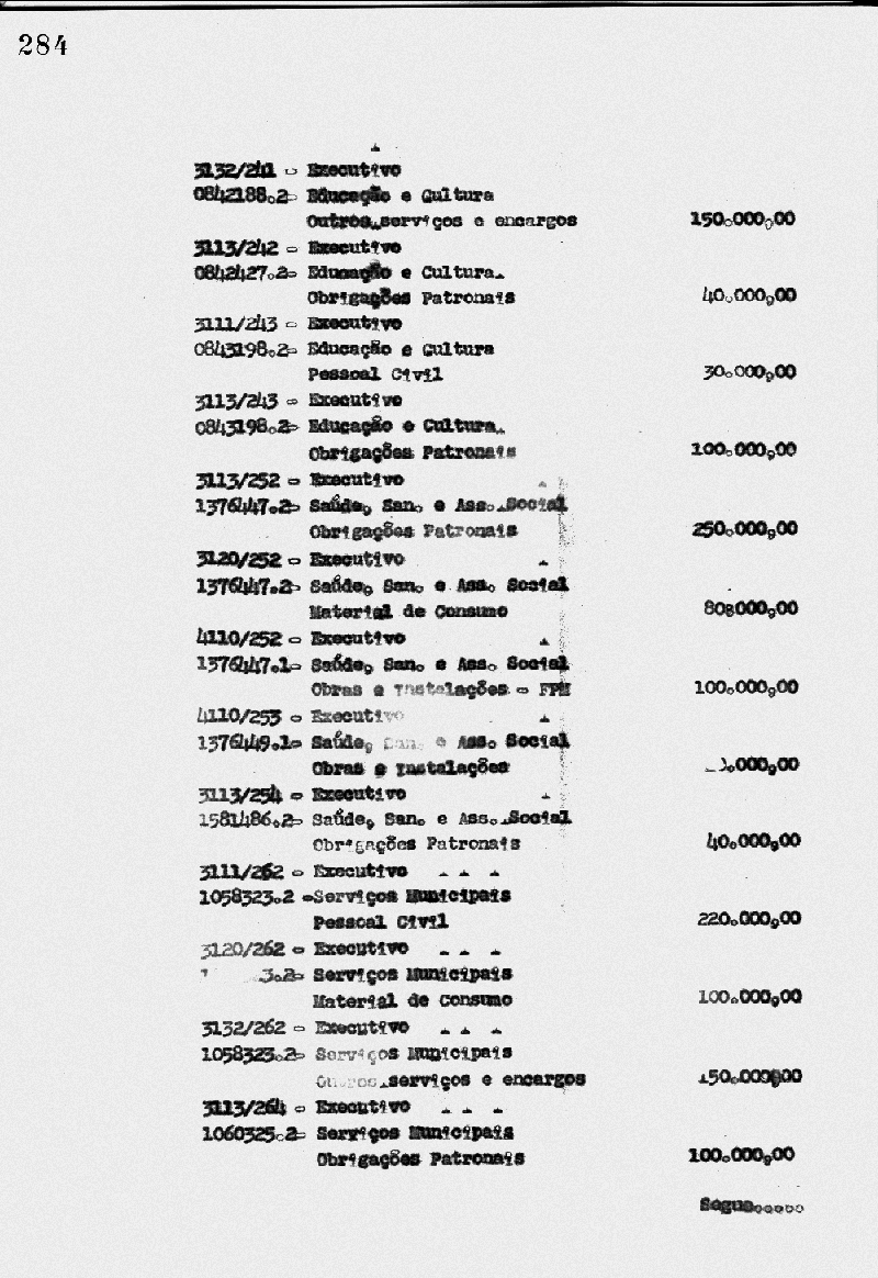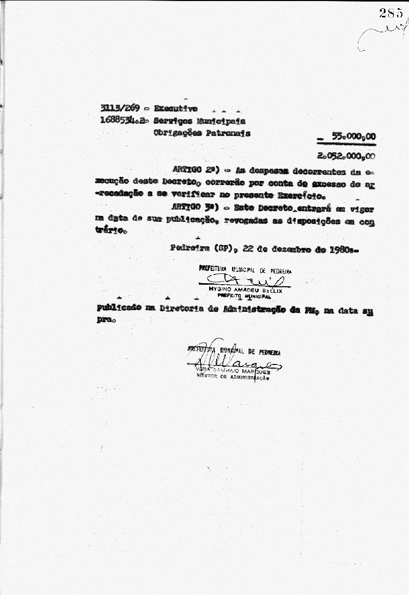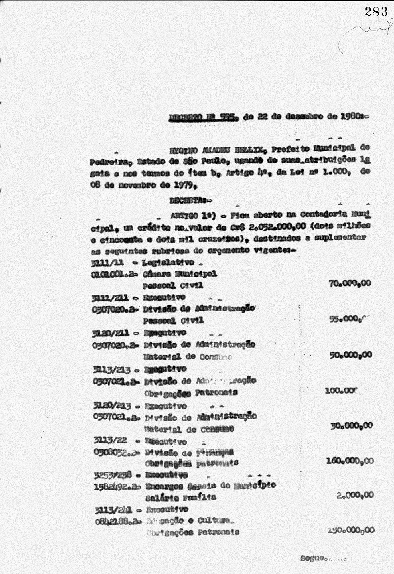 Ementa: Artigo 1° - Fica aberto na Contadoria Municipal, um crédito no valor de Cr$ 2.052.000,00 (dois milhões e cinquenta e dois mil cruzeiros), destinados a suplementar as seguintes rubricas do orçamento vigente