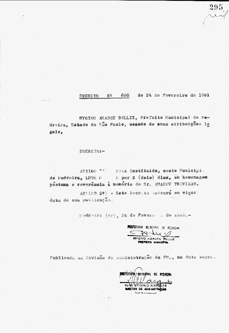 Ementa: Artigo 1° - Fica instituído, neste município de Pedreira, Luto Oficial, em homenagem póstuma a reverência à memória do Sr. Amadeu Trevizan