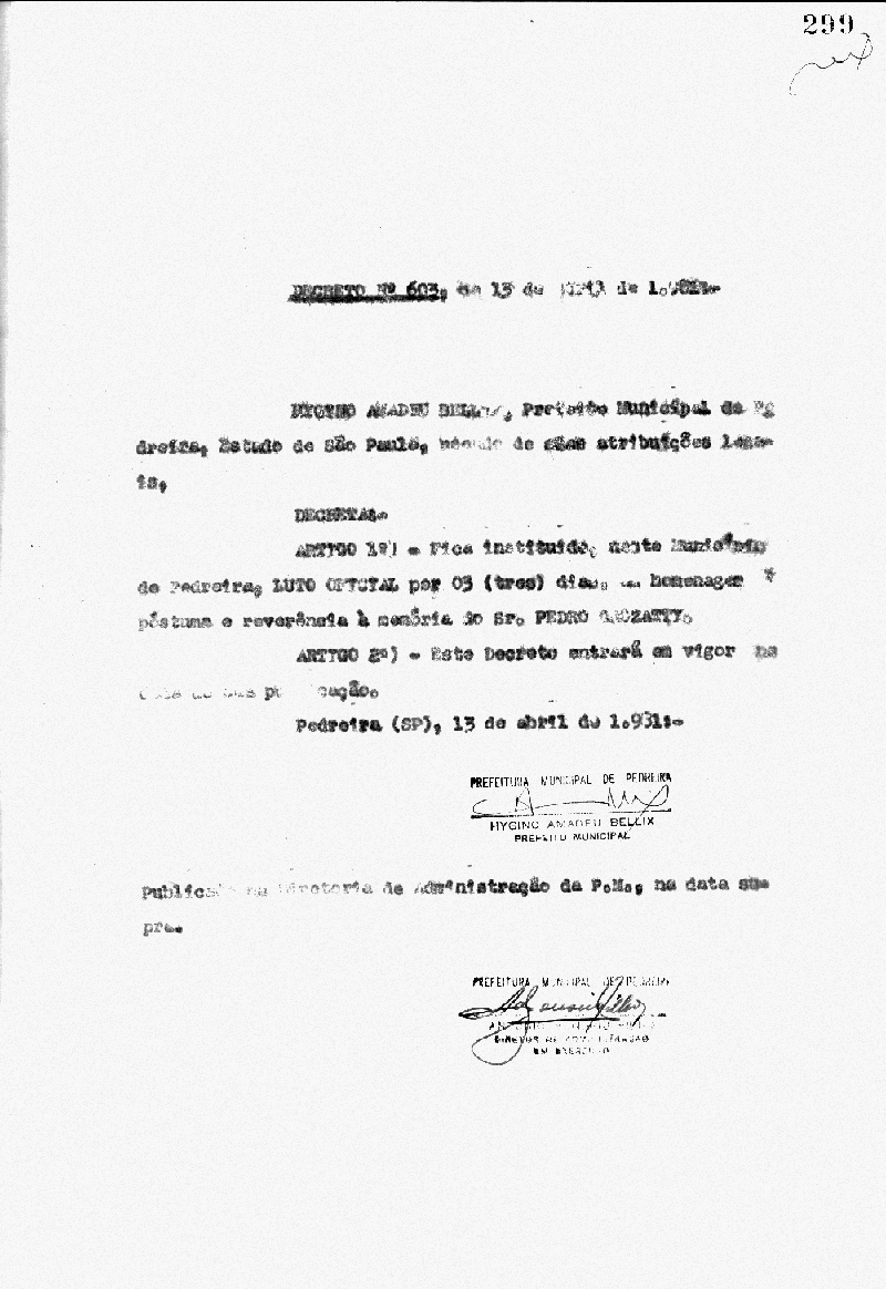 Ementa: Artigo 1° - Fica instituído neste Município de Pedreira, Luto Oficial, em homenagem póstuma e reverência à memória do Sr. Pedro Zatty