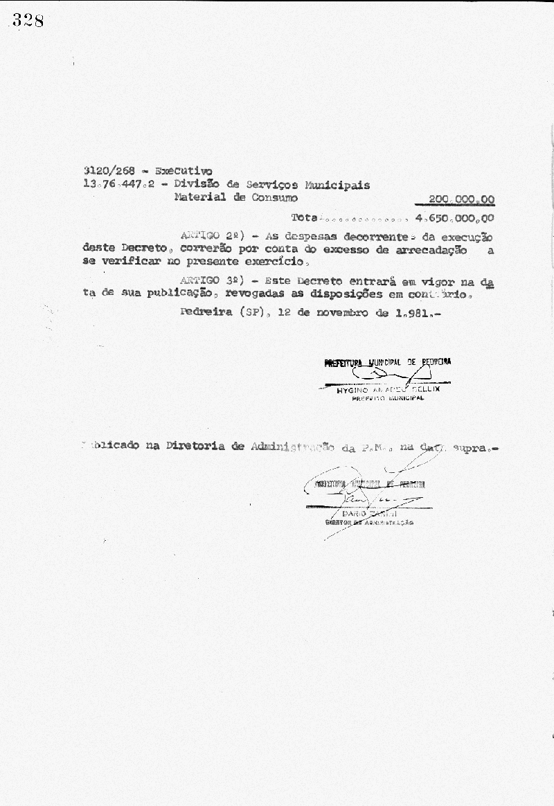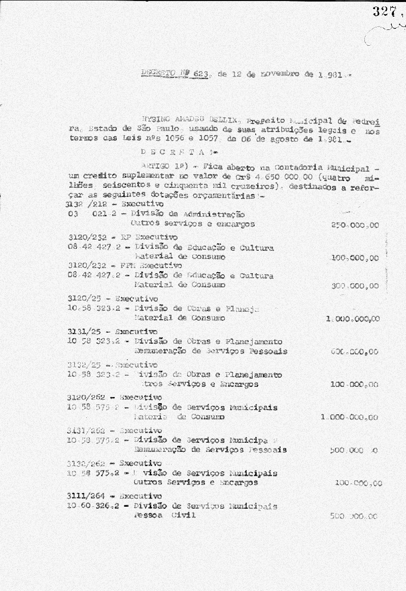 Ementa: Artigo 1° - Fica aberto na Contadoria Municipal, um crédito no valor de Cr$ 4.650.000,00 (quatro milhões e seiscentos cinquenta mil cruzeiros), destinados a suplementar as seguintes rubricas do orçamento vigente
