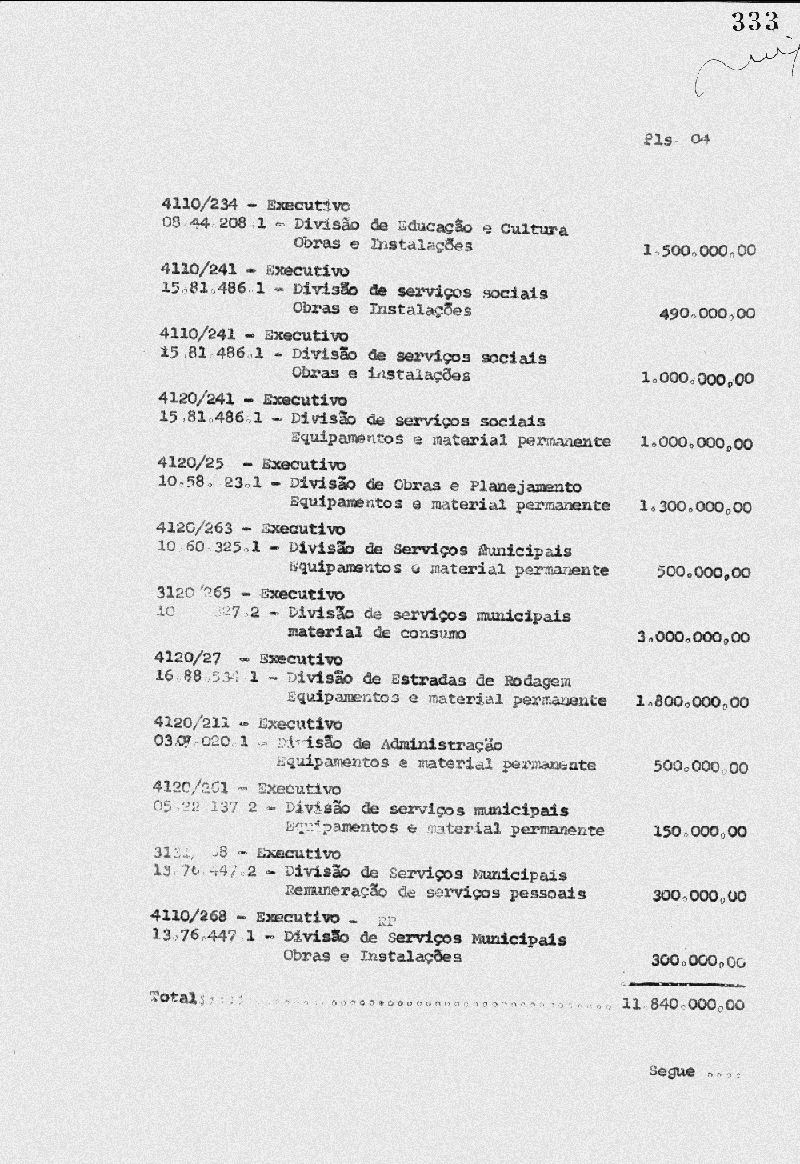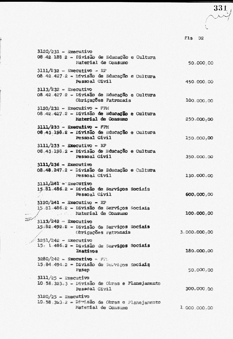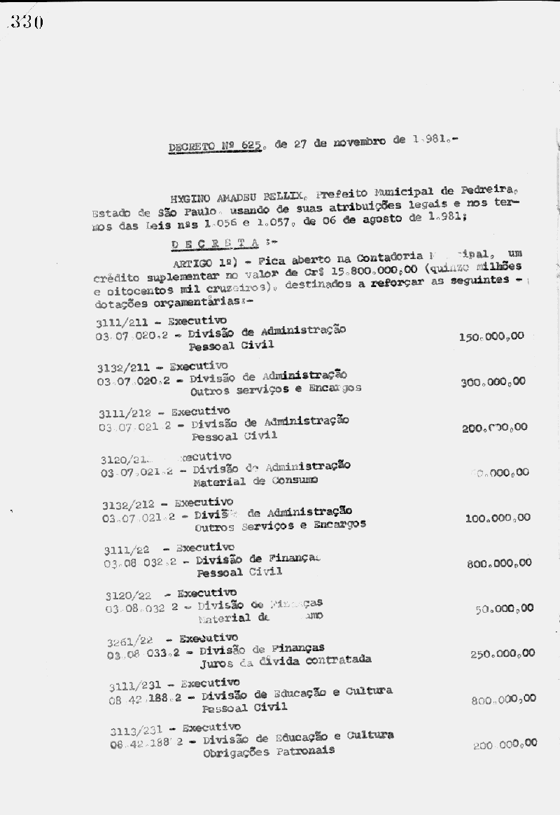 Ementa: Artigo 1° - Fica aberto na Contadoria Municipal, um crédito no valor de Cr$ 15.800.000,00 (quinze milhões e oitocentos mil cruzeiros), destinados a suplementar as seguintes rubricas do orçamento vigente
