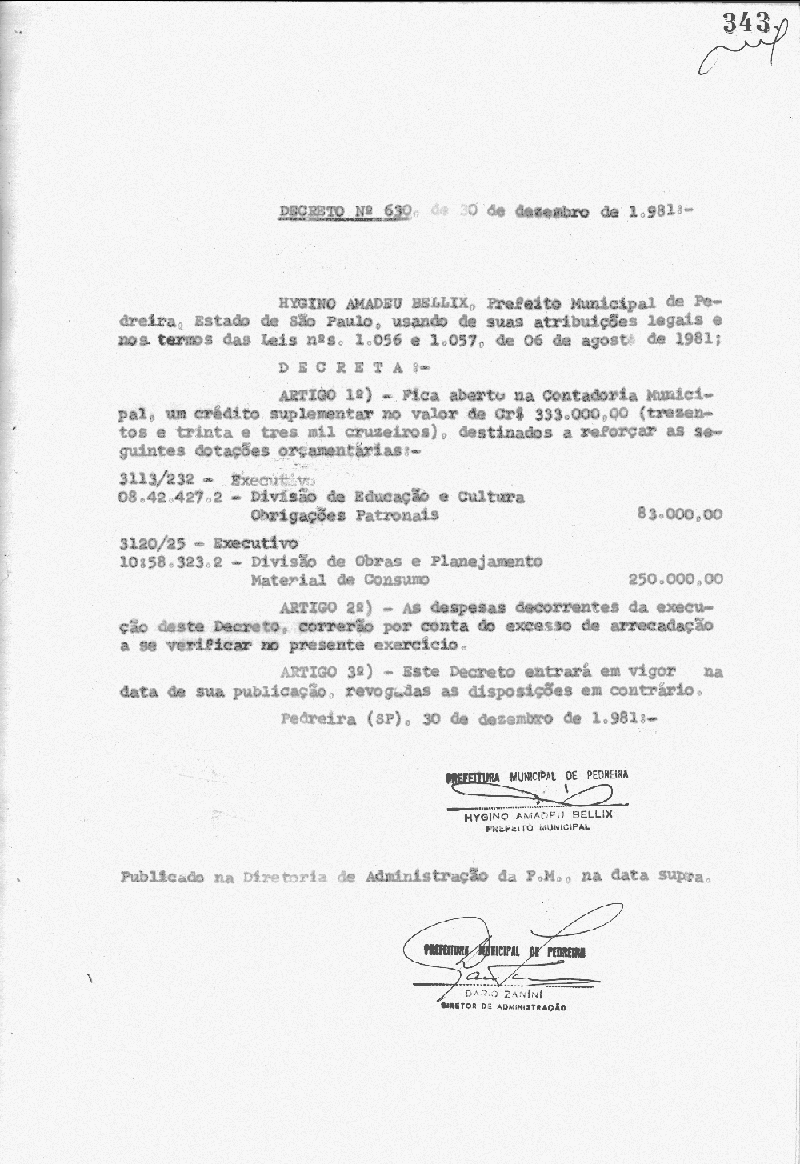 Ementa: Artigo 1° - Fica aberto na Contadoria Municipal, um crédito no valor de Cr$ 333.000,00 (trezentos e trinta e três mil cruzeiros), destinados a suplementar as seguintes rubricas do orçamento vigente
