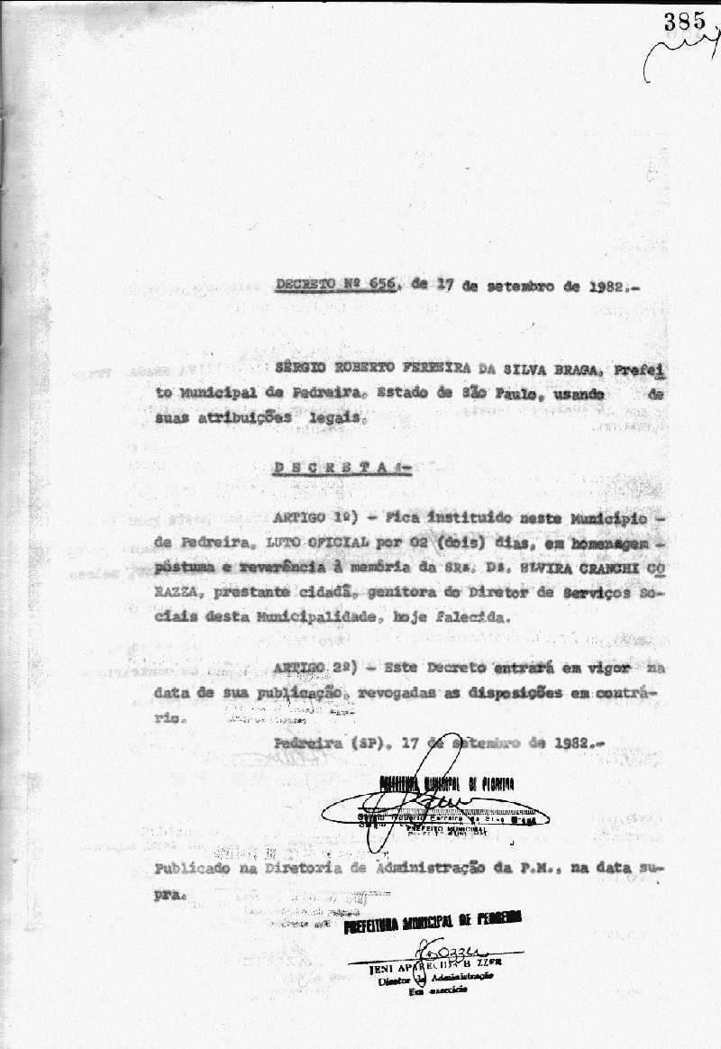 Ementa: Artigo 1° - Fica instituído neste Município de Pedreira, Luto Oficial, em homenagem à memória da Sra. Da. Silvira Cranchi Corazza