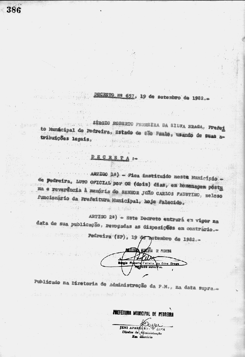 Ementa: Artigo 1° - Fica instituído neste Município de Pedreira, Luto Oficial, em homenagem à memória do Sr. João Carlos Faustino