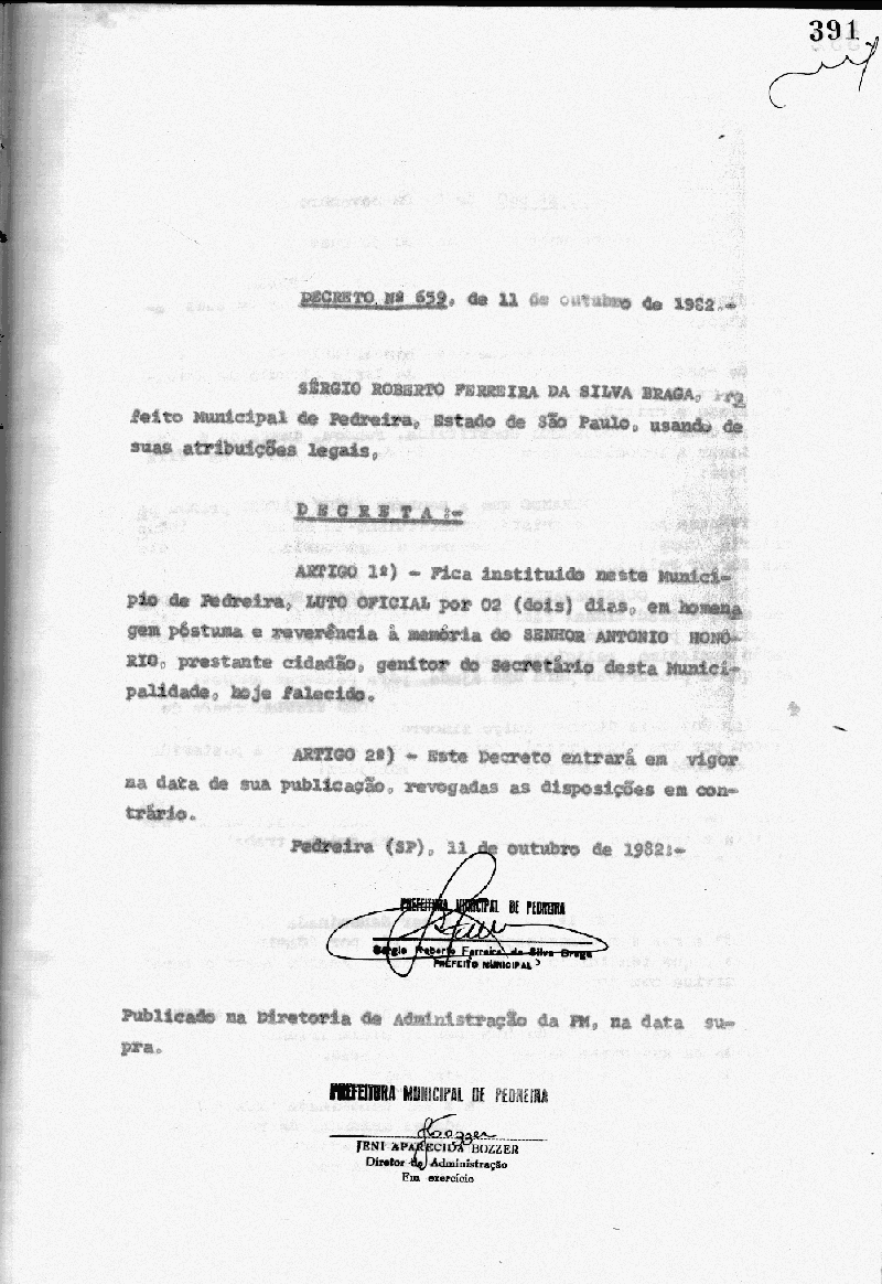 Ementa: Artigo 1° - Fica instituído neste município de Pedreira, Luto Oficial, em homenagem à memória do Sr. Antonio Honório