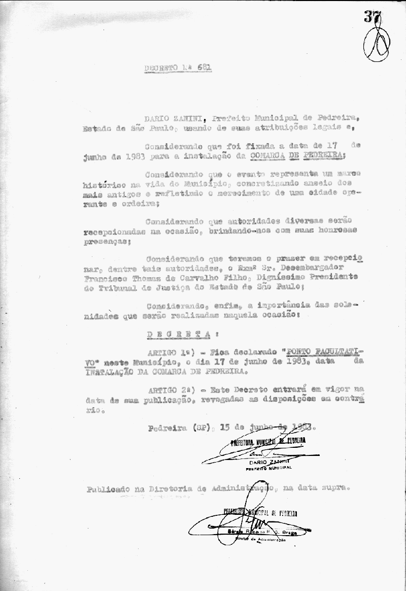 Ementa: Considerando que foi fixada a data de 17 de junho de 1983 para a utilização da Comarca de Pedreira