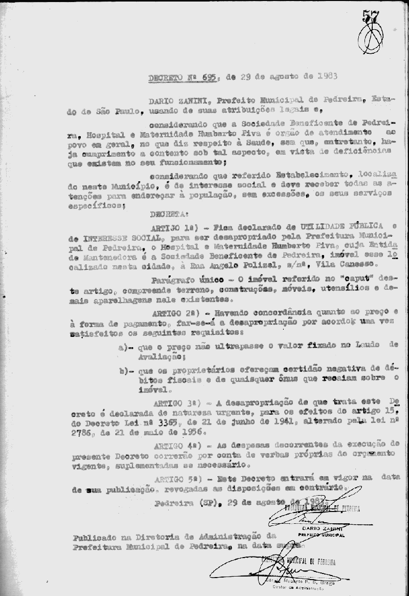 Ementa: Fica declarado de utilidade pública e de interesse social, para ser desapropriado pela Prefeitura Municipal de Pedreira, o Hospital e Maternidade Humberto Piva, cuja Entidade Mantedora é a Sociedade Beneficente de Pedreira, imóvel esse localizado nesta cidade, à rua Angelo Polizel, s/nº, Vila canesso.
