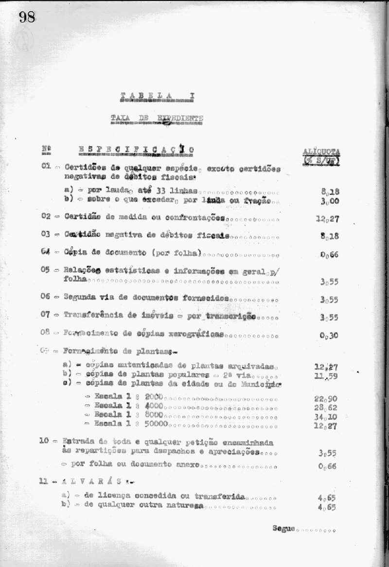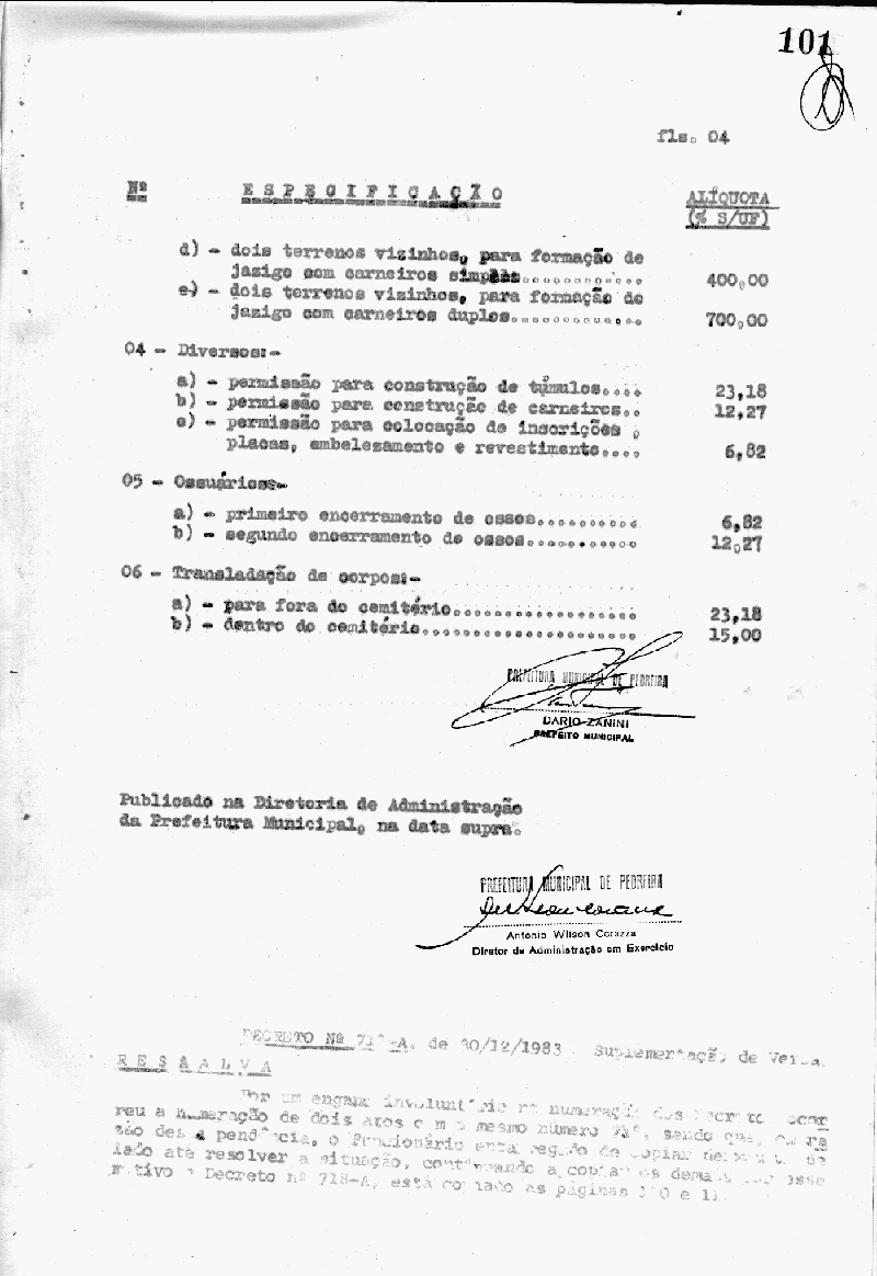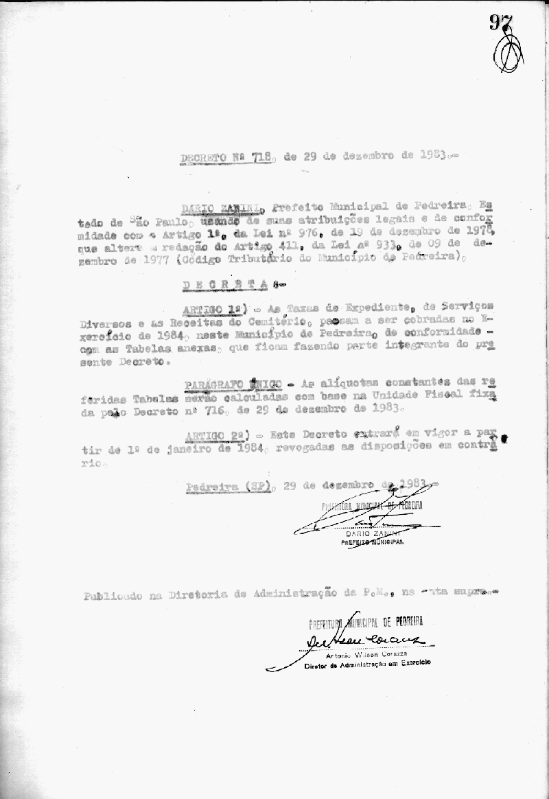 Ementa: Artigo 1º As taxas de Expediente, de Serviços Diversos e as Receitas do Cemitério, passam a ser cobradas no Exercício de 1984.