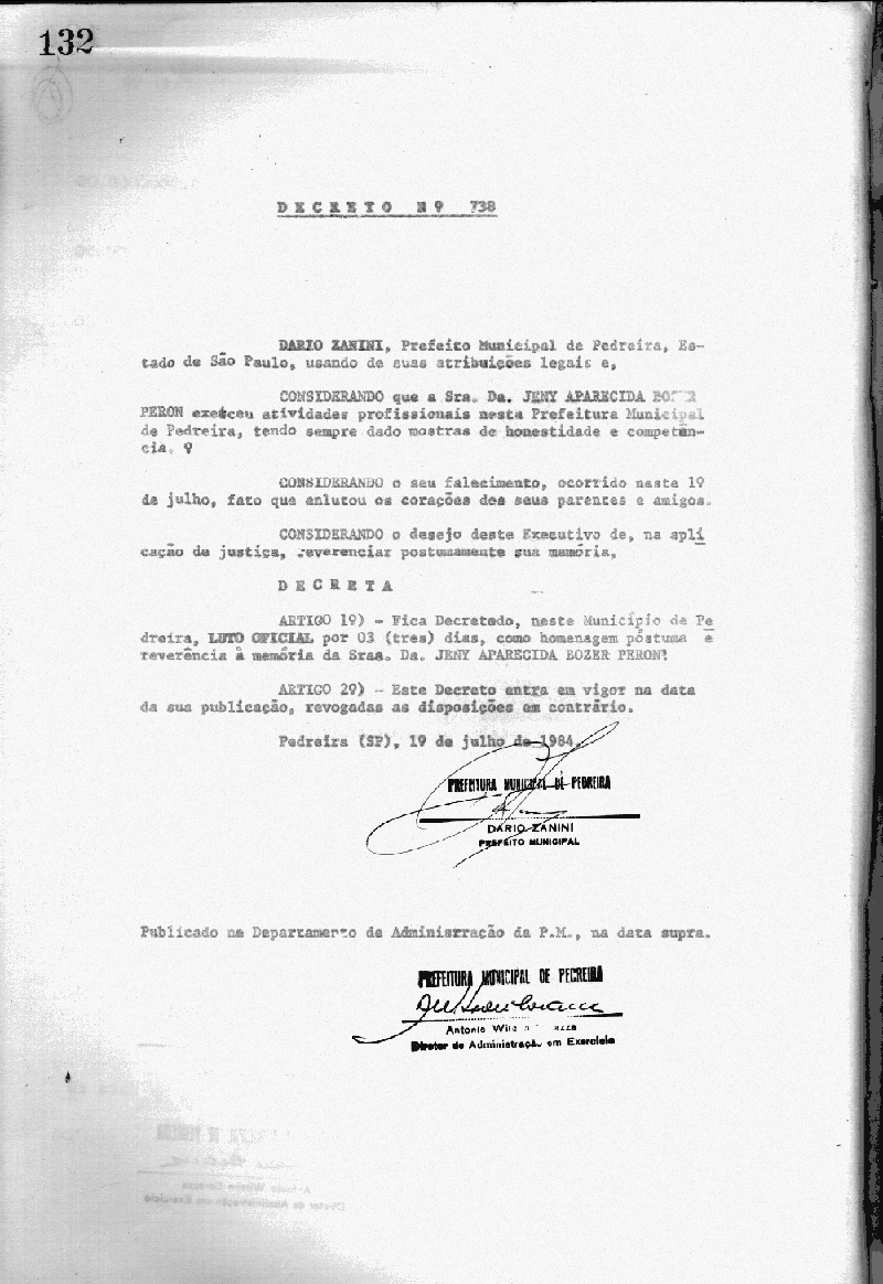 Ementa: Artigo 1º Fica decretado, neste município de Pedreira , LUTO OFICIAL por 3 (três) dias, como homenagem póstuma e reverência à memória da Srª. Dª Jeny Aparecida Bozer Peron.