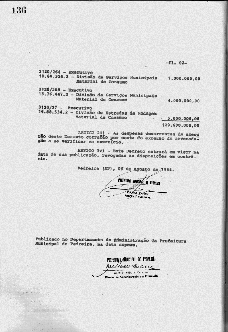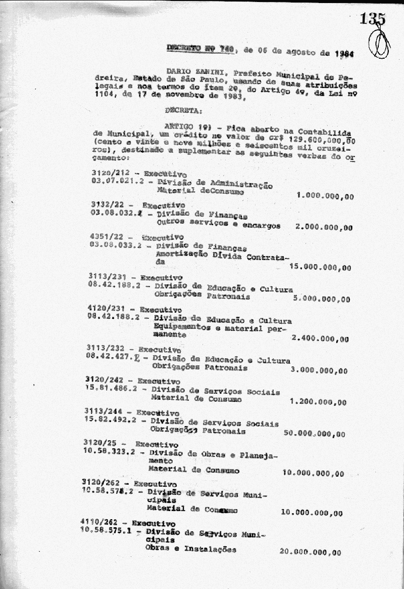 Ementa: Artigo 1° - Fica aberto na Contabilidade Municipal, um crédito no valor de Cr$ 129.600.000,00 (cento e vinte e nove milhões e seiscentos mil cruzeiros), destinados a suplementar as seguintes verbas do orçamento