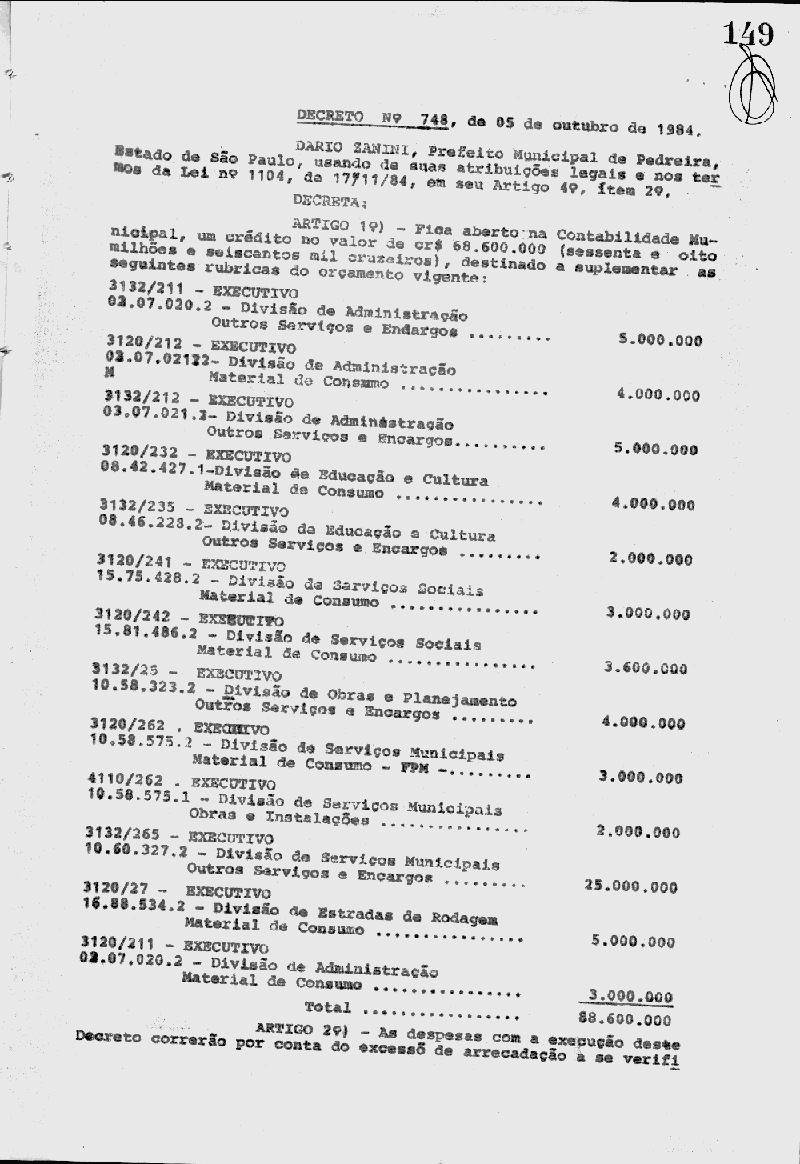 Ementa: Artigo 1° - Fica aberto na Contabilidade Municipal, um crédito no valor de Cr$ 68.600.000,00 (sessenta e oito milhões e seiscentos mil cruzeiros), destinados a suplementar as seguintes rubricas do orçamento vigente