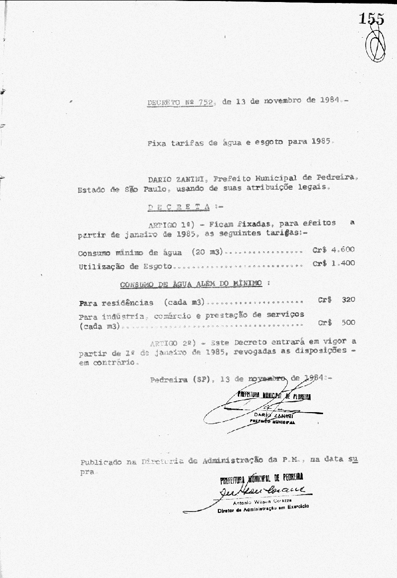 Ementa: Fixa tarifas de água e esgoto para 1985