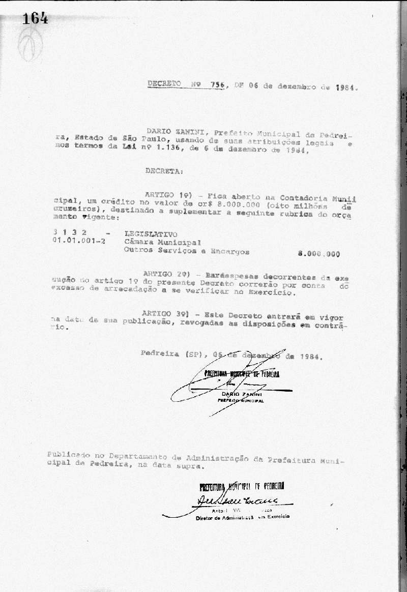 Ementa: Artigo 1° - Fica aberto na Contabilidade Municipal, um crédito no valor de Cr$ 8.000.000,00 (oito milhões de cruzeiros), destinados a suplementar a seguinte rubricas do orçamento vigente