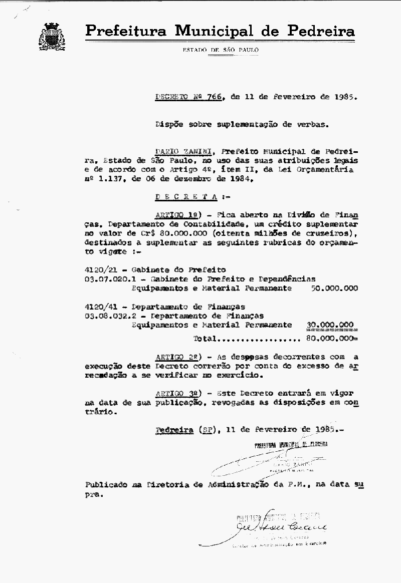 Ementa: Artigo 1º Os cheques emitidos pela prefeitura municipal de Pedreira e os endossos de cheques para depósitos, serão assinados cumulativamente pelo prefeito municipal em conjunto com o diretor de Finanças e/ou tesoureiro municipal.