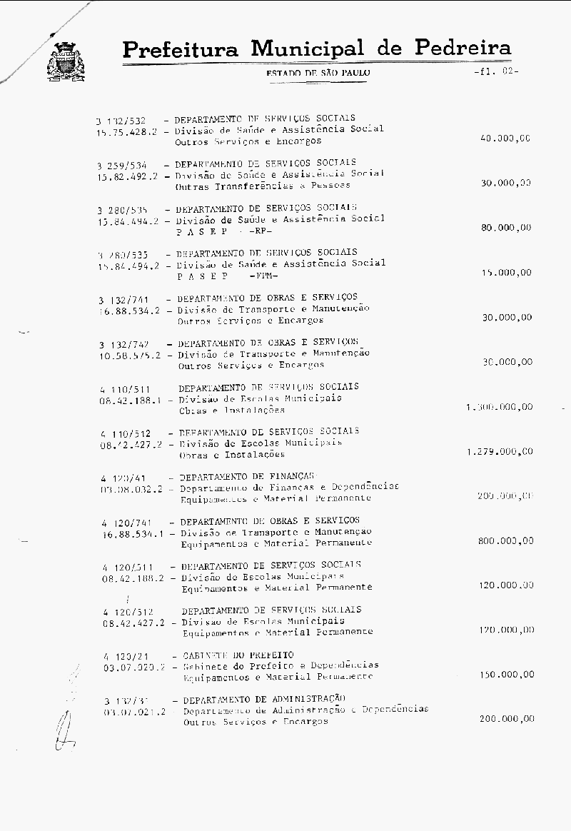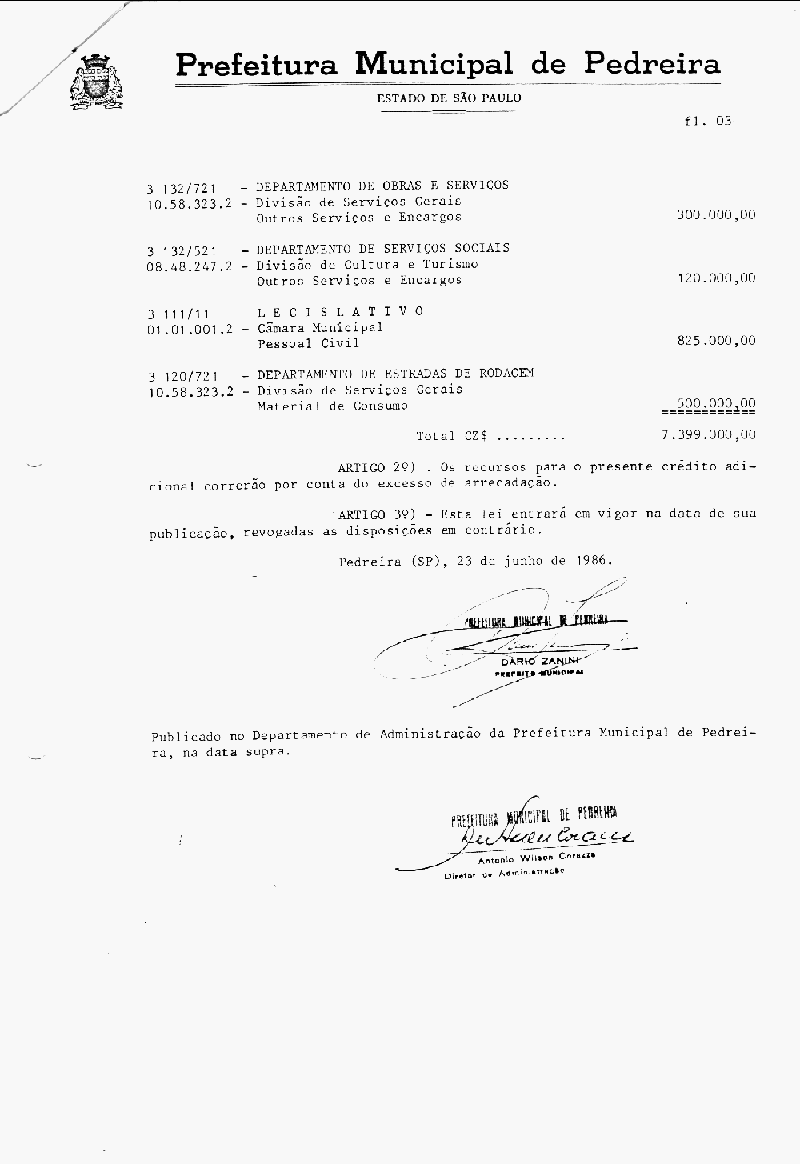 Ementa: Artigo 1° - Fica aberto no departamento de Finanças, um crédito no valor de Cr$ 7.399.000,00 (sete milhões e trezentos e noventa e nove mil cruzeiros), destinados a suplementar as seguintes rubricas vigente
