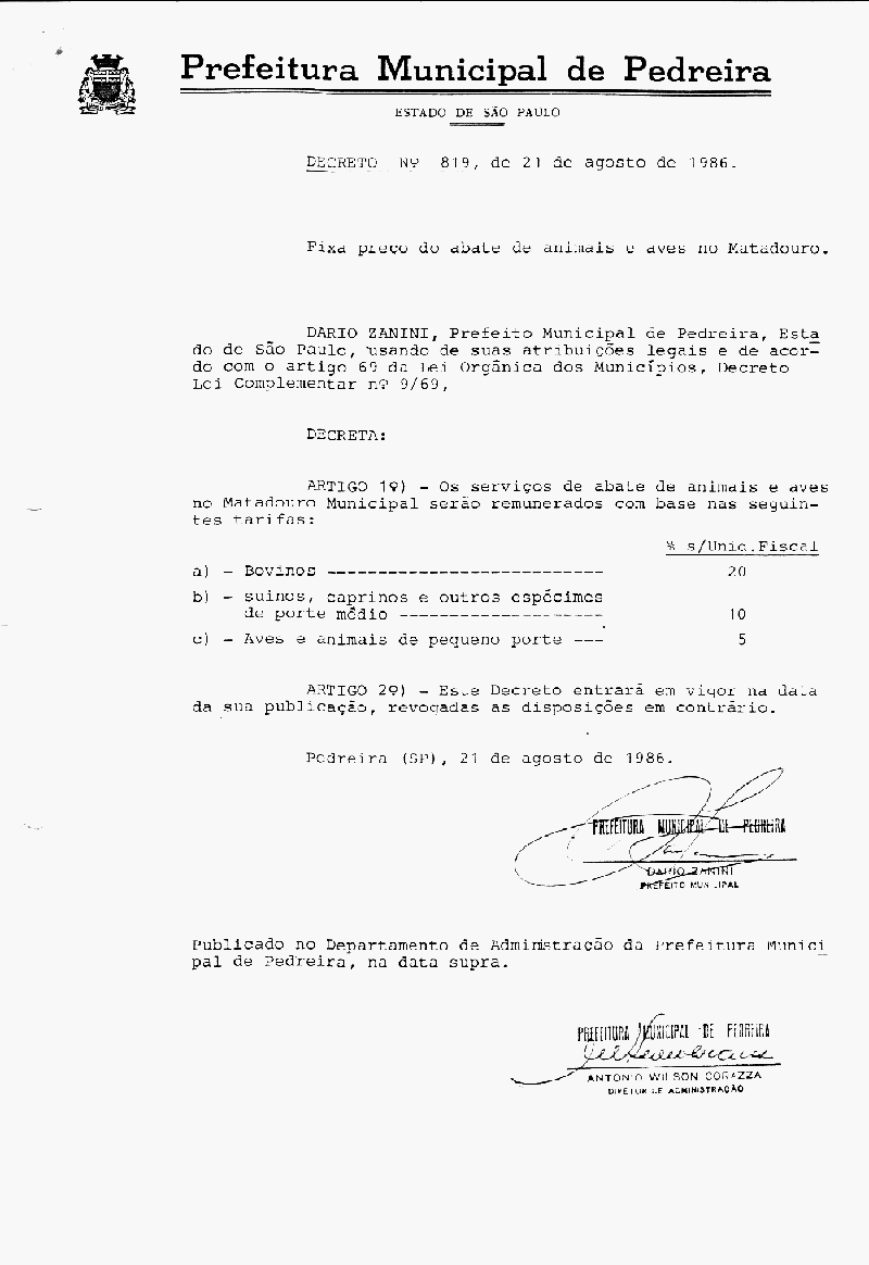 Ementa: Fixa preço do abate de animais e aves no Matadouro