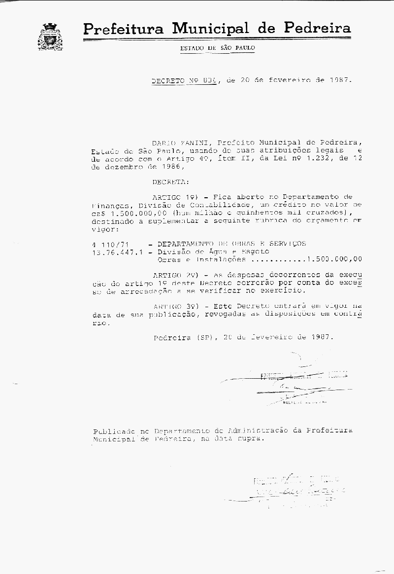 Ementa: Artigo 1° - Fica aberto no departamento de finanças, um crédito no valor de Cr$ 1.500.000,00 (um milhão e quinhentos mil cruzeiros), destinados a suplementar as seguintes rubricas do orçamento vigente