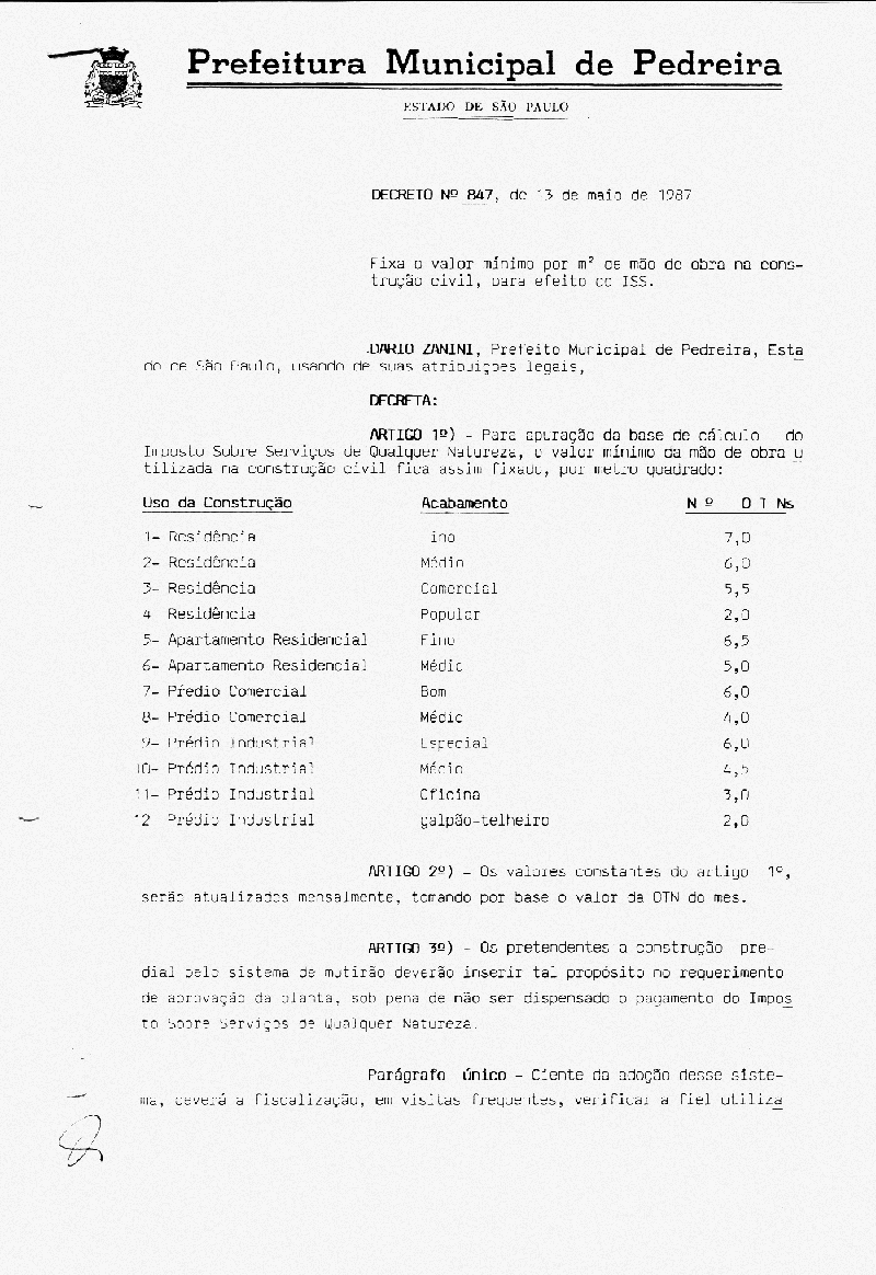Ementa: Fixa o valor mínimo do m/2 de mão de obra na construção civil, para efeitos de ISS