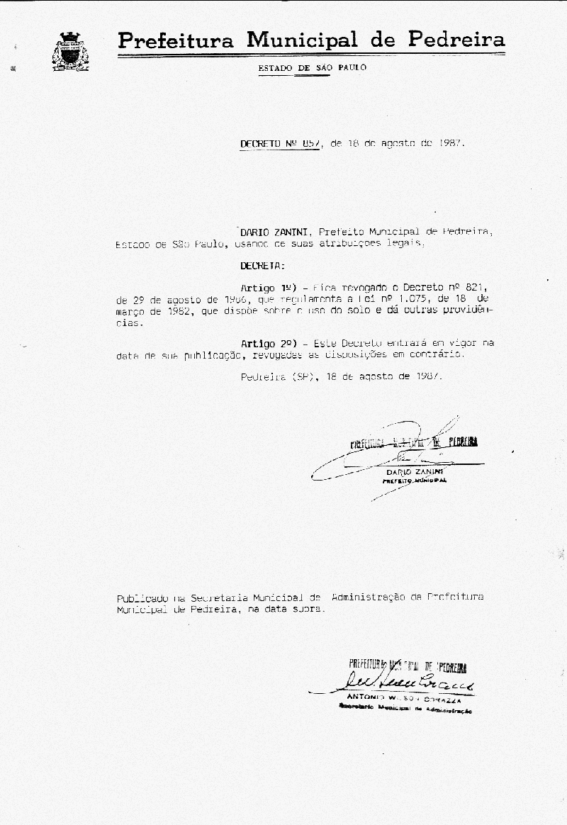 Ementa: Artigo 1° - Fica revogado o Decreto n° 821, de 29 de agosto de 1986, que regulamenta a Lei n° 1.075, de 18 de março de 1982, que dispõe sobre o uso do solo e dá outras providências