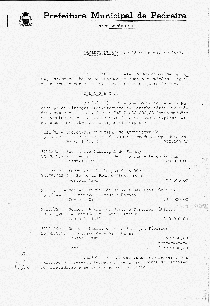 Ementa: Artigo 1 ° - Fica aberto no Departamento de Finanças, um crédito no valor de Cr$ 2.630.000,00 (dois milhões e seiscentos e trinta mil cruzeiros), destinados a suplementar as seguintes rubricas do orçamento vigentes