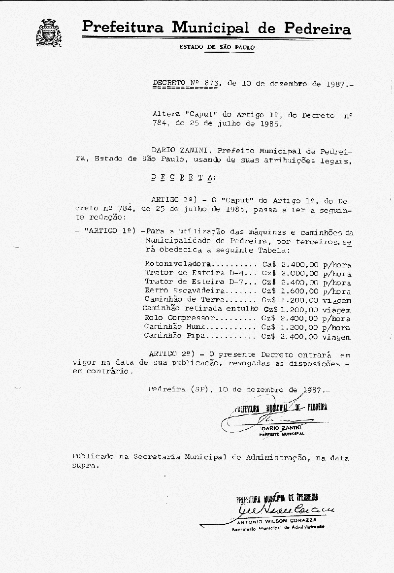 Ementa: Altera "Caput" do Artigo 1°, do Decreto n° 784, de 25 de julho de 1985