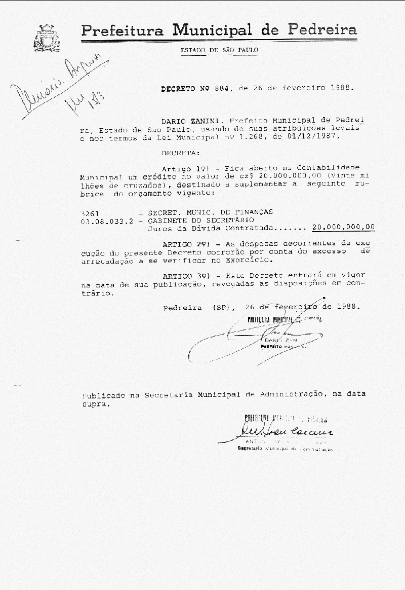 Ementa: Artigo 1° - Fica aberto na Contabilidade Municipal um crédito no valor de Cr$ 20.000.000,00 (vinte milhão de cruzados), destinados a suplementar as seguintes rubricas vigentes