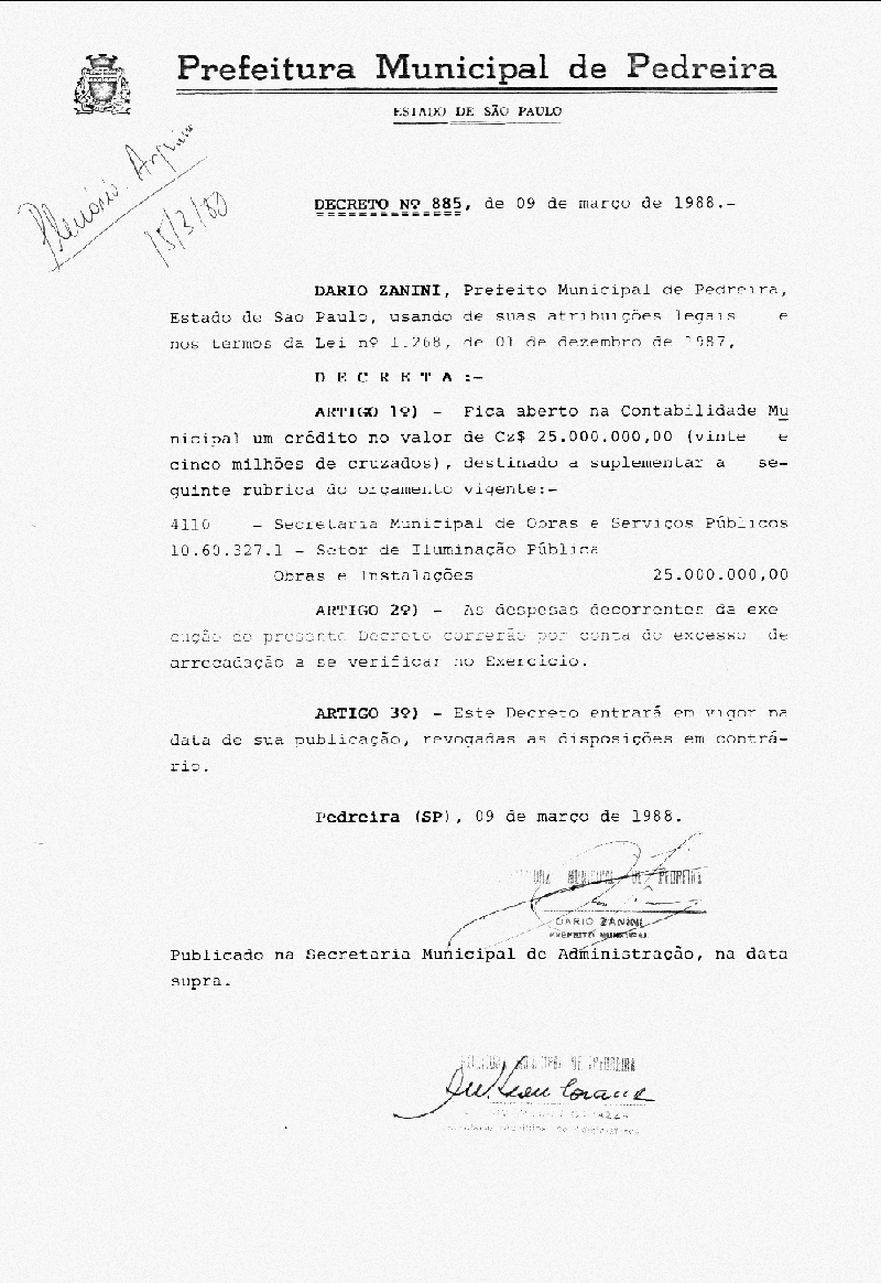 Ementa: Artigo 1° - Fica aberto na Contabilidade Municipal um crédito no valor de Cr$ 25.000.000,00 (vinte e cinco milhão de cruzados), destinados a suplementar as seguintes rubricas vigentes