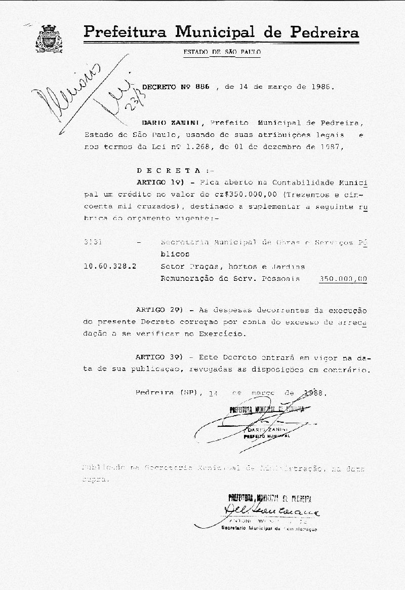 Ementa: Artigo 1° - Fica aberto na Contabilidade Municipal um crédito no valor de Cr$ 350.000,00 (trezentos e cinquenta mil cruzados), destinados a suplementar as seguintes rubricas vigentes
