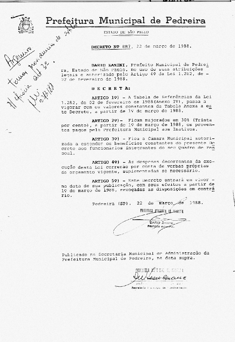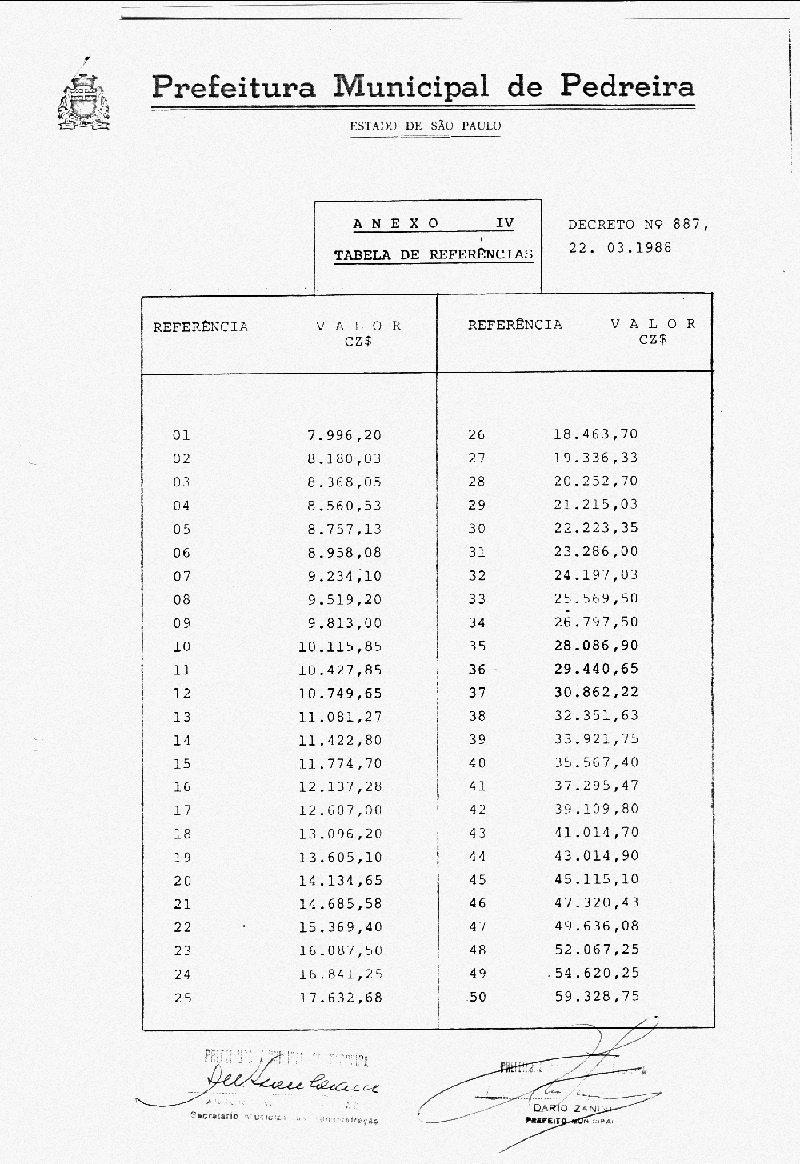 Ementa: Artigo 1° - A tabela de referência da Lei n° 1.282, de 02 de fevereiro de 1988 (Anexo IV), passa a vigorar com os valores constantes da tabela Anexa a este Decreto, a partir de 1° de março de 1988