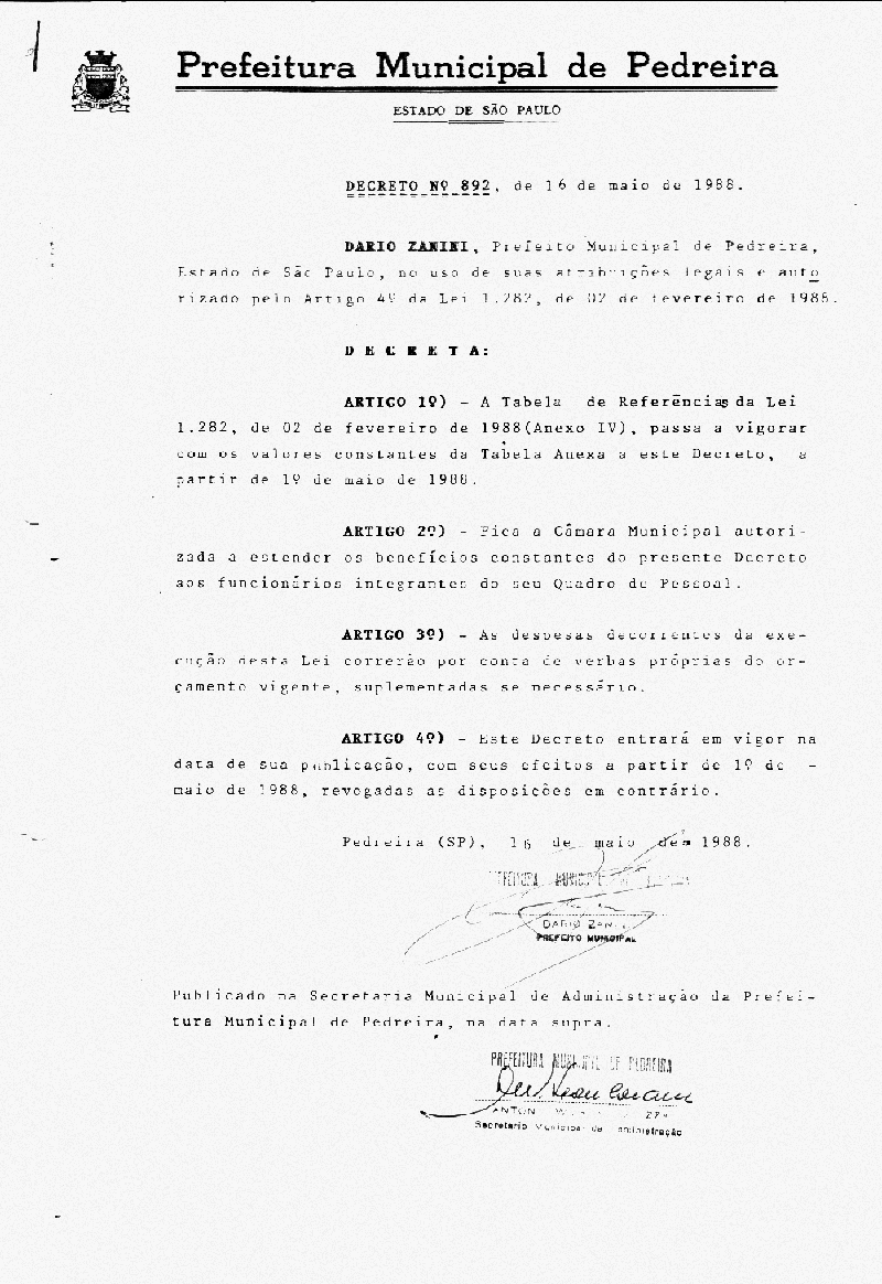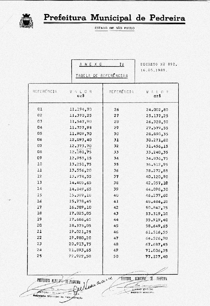 Ementa: Artigo 1° - A tabela de referência da Lei 1282, de 02 de fevereiro de 1988 (Anexo IV), passa a vigorar com os valores constantes da Tabela Anexa a este Decreto, a partir de 19 de maio de 1988