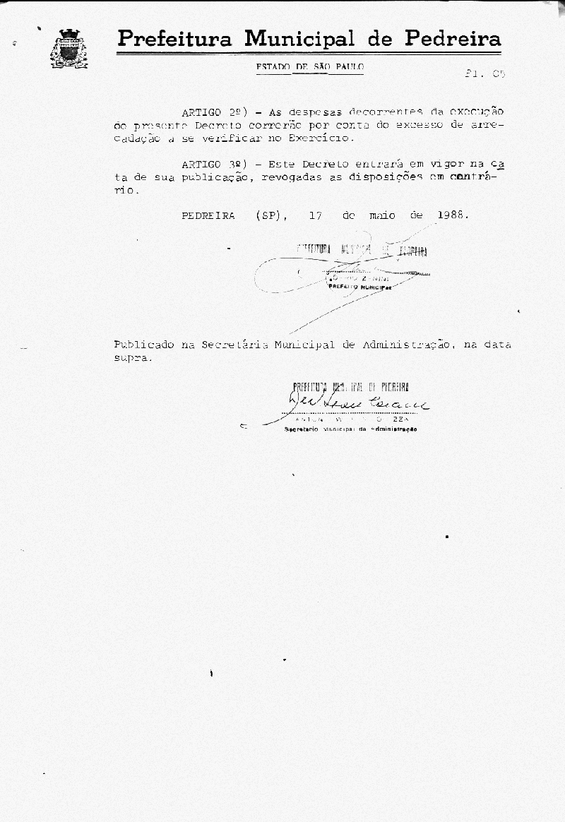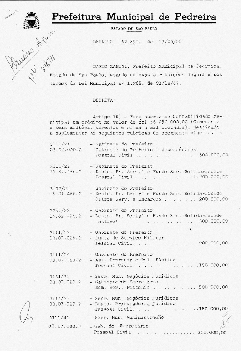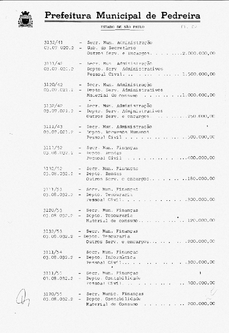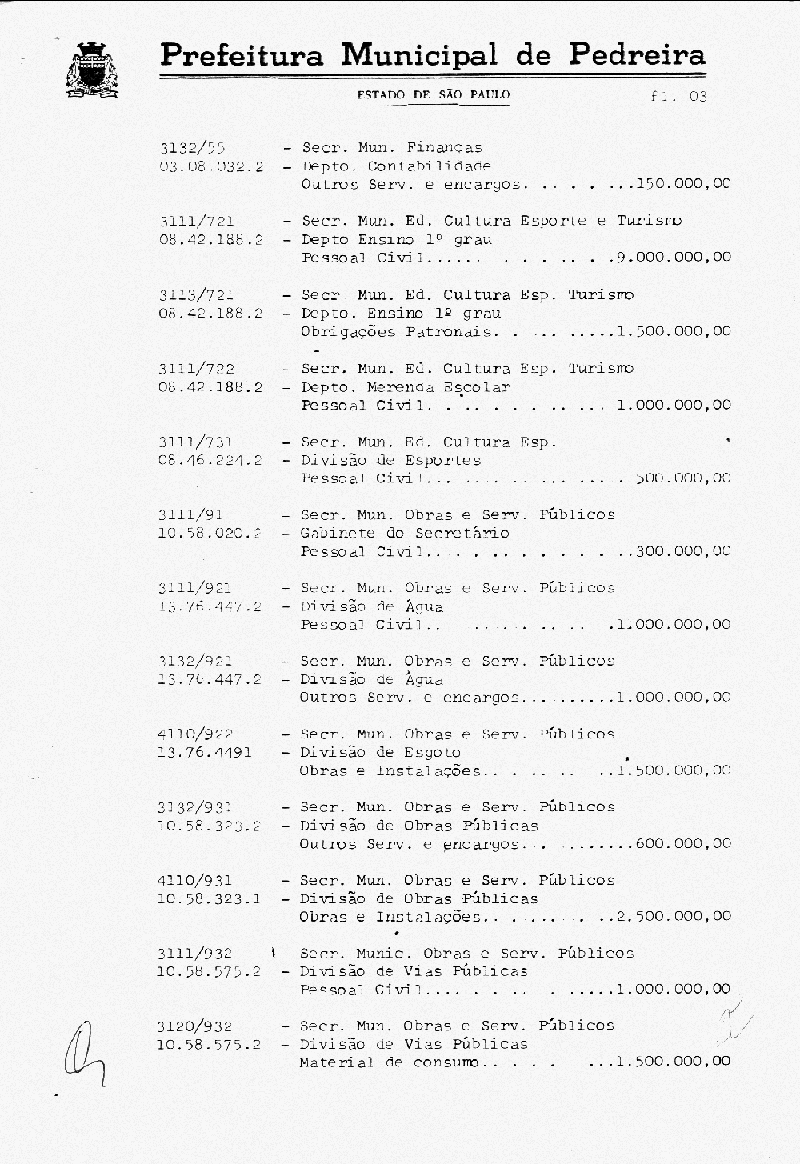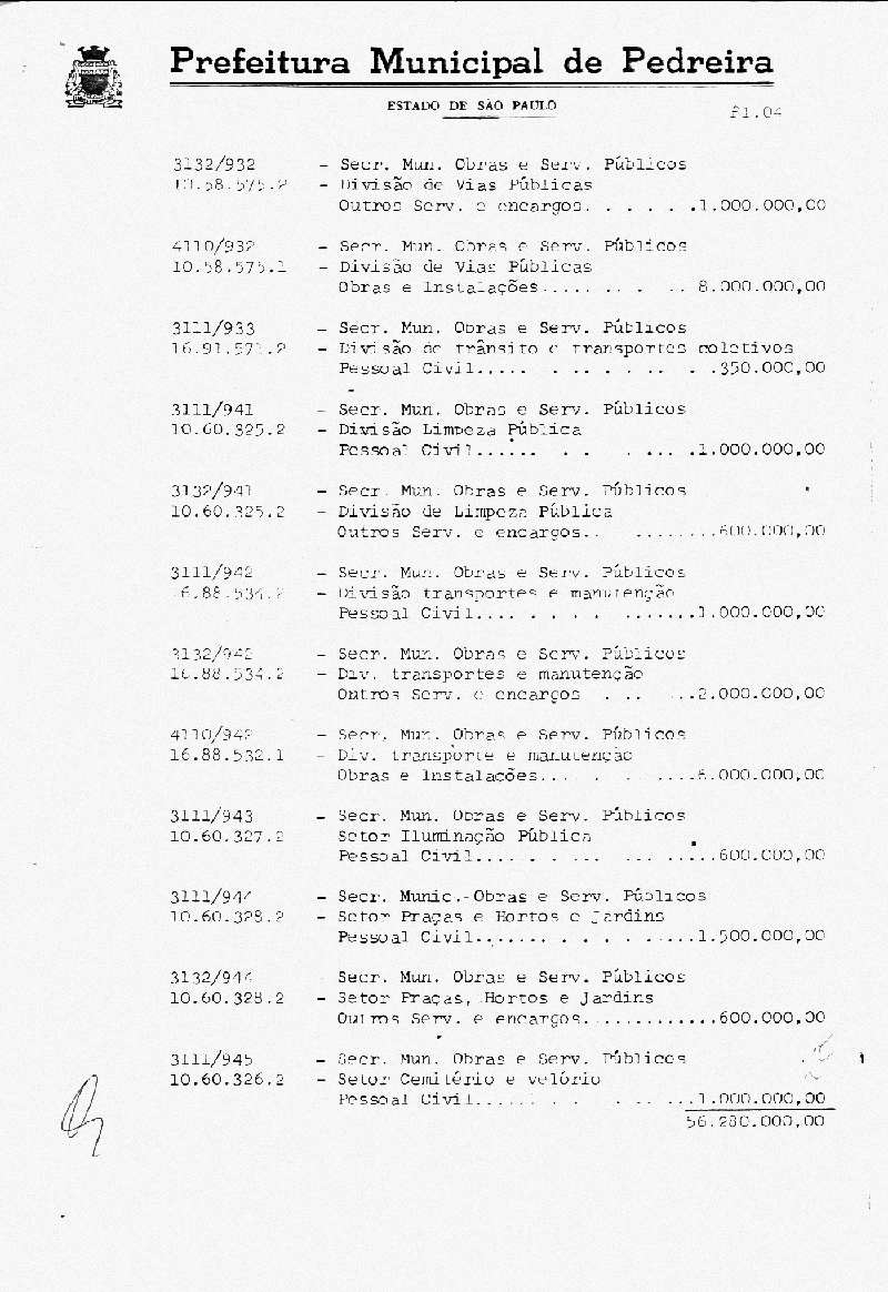 Ementa: Artigo 1° - Fica aberto na Contabilidade Municipal um crédito no valor de Cr$ 56.280.000,00 (cinquenta milhões e duzentos e oitenta mil cruzeiros), destinados a suplementar as seguinte rubricas vigentes