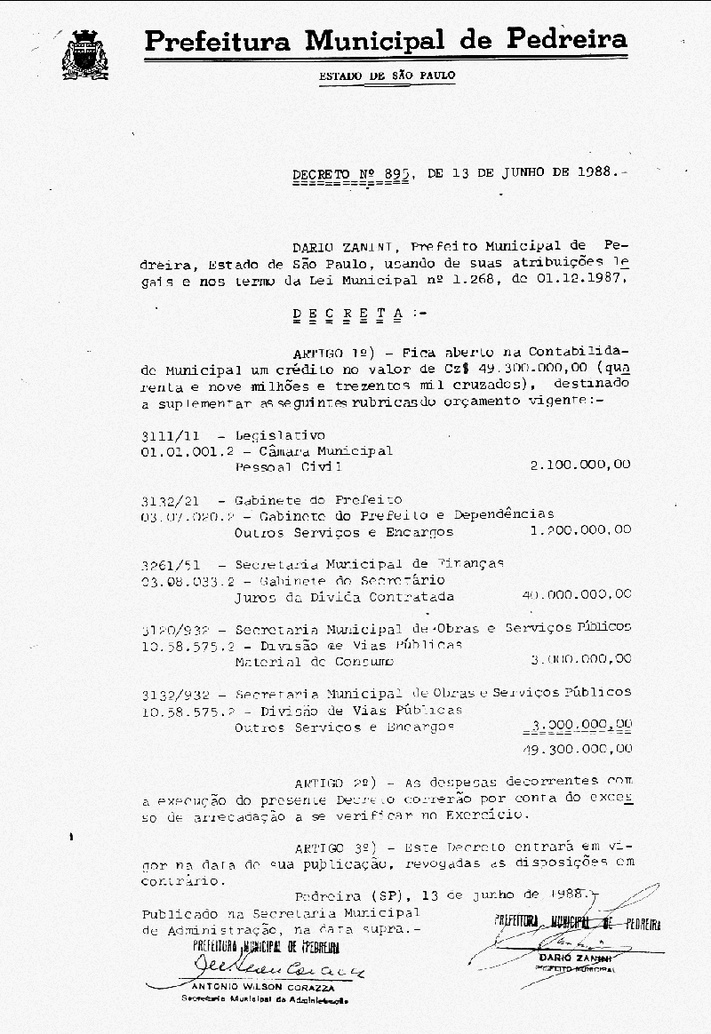 Ementa: Artigo 1° - Fica aberto na Contabilidade Municipal um crédito no valor de Cr$ 49.300.000,00 (quarenta e nove milhões e trezentos mil cruzeiros), destinados a suplementar as rubricas vigentes