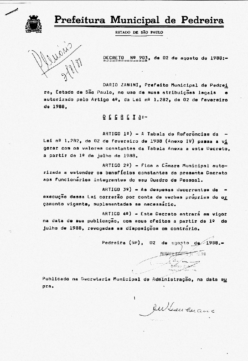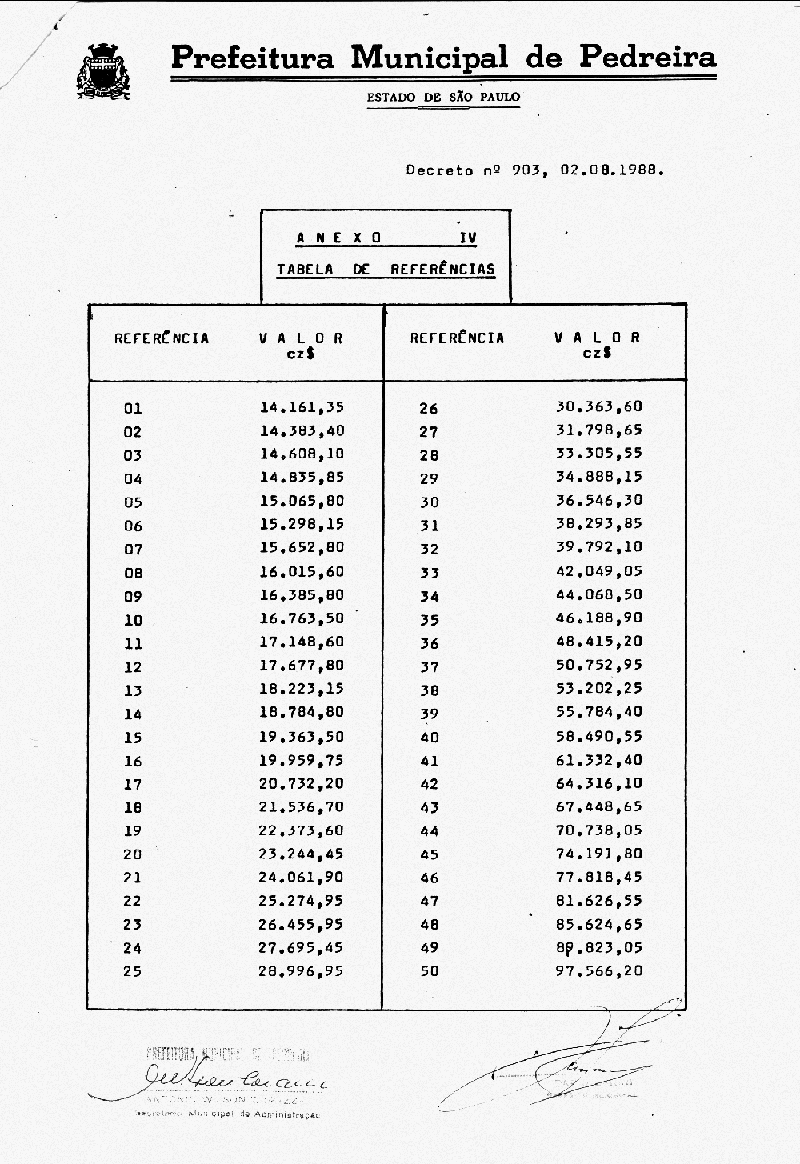Ementa: Artigo 1° - A Tabela de Referência da lei n° 1.282, de 02 de fevereiro de 1988 (Anexo IV) passa a vigorar com os valores constantes da Tabela Anexa a este Decreto, a partir de 1° de julho de 1988
