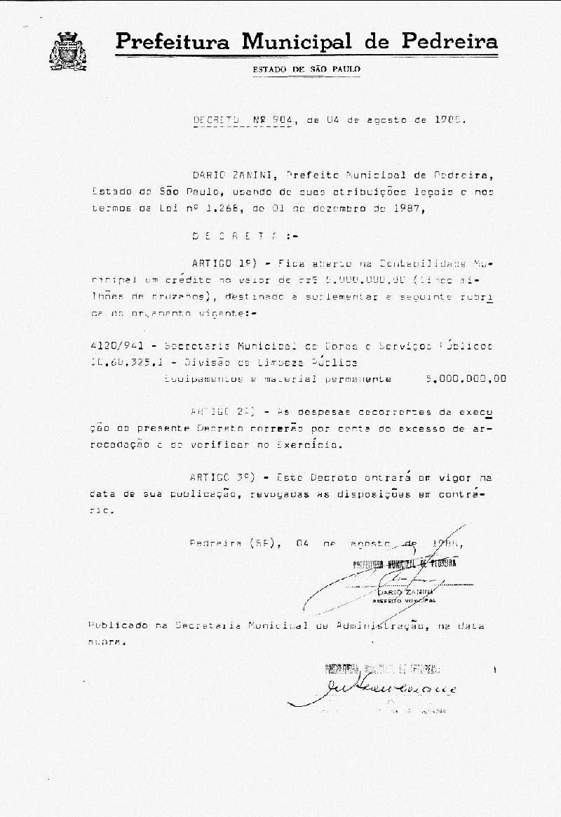 Ementa: Artigo 1° - Fica aberto na Contabilidade Municipal um crédito no valor de Cr$ 5.000.000,00 (cinco milhões de cruzeiros), destinados a suplementar as seguinte rubricas vigentes