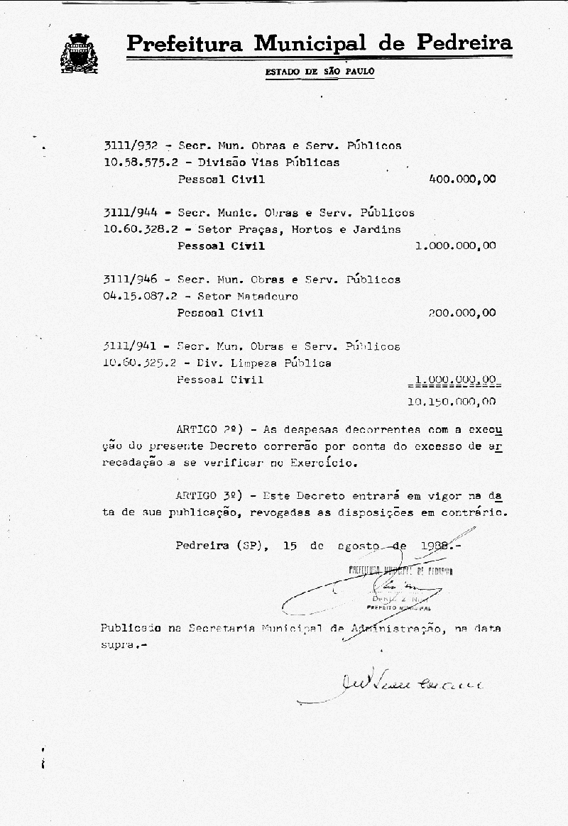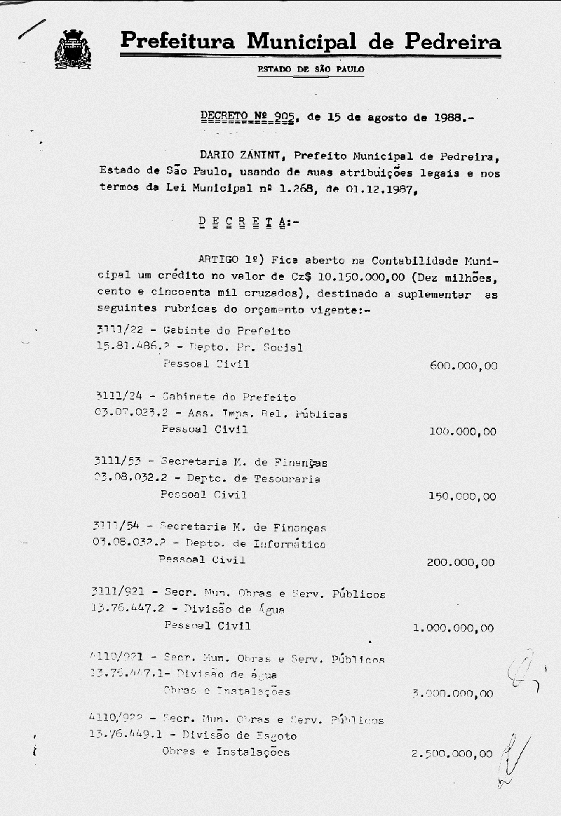 Ementa: Artigo 1° - Fica aberto na Contabilidade Municipal um crédito no valor de Cr$ 10.150.000,00 (dez milhões e cento e cinquenta mil cruzeiros), destinados a suplementar as seguinte rubricas vigentes