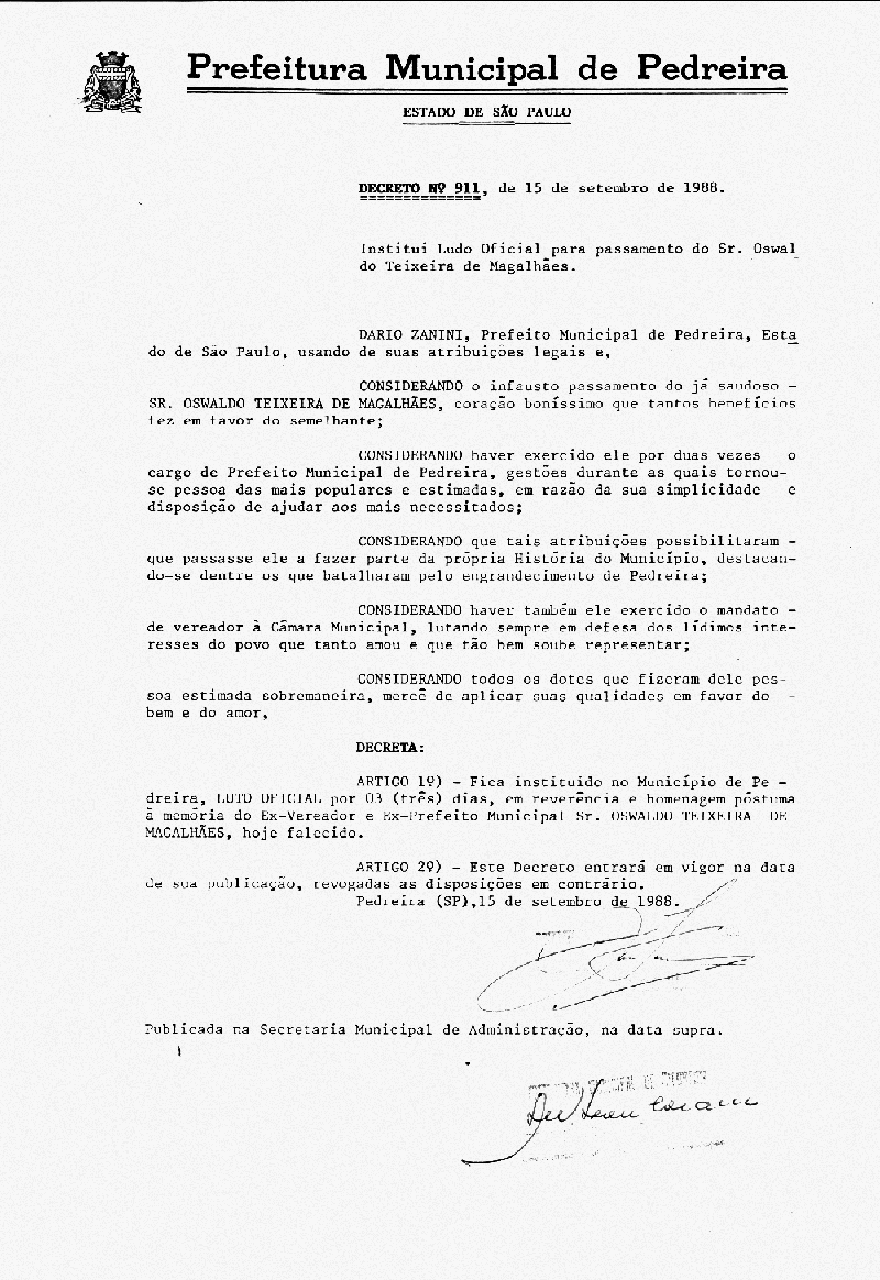 Ementa: Institui Luto Oficial para passamento do Sr. Oswaldo Teixeira de Magalhães