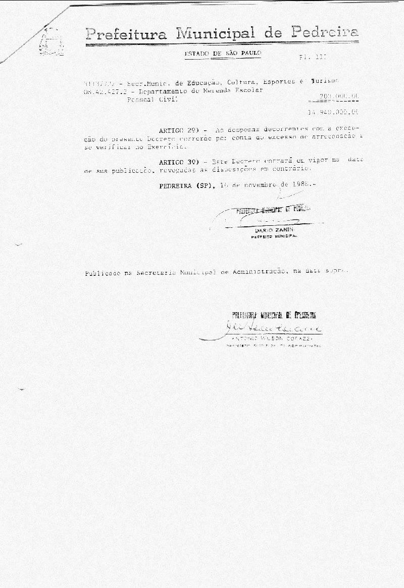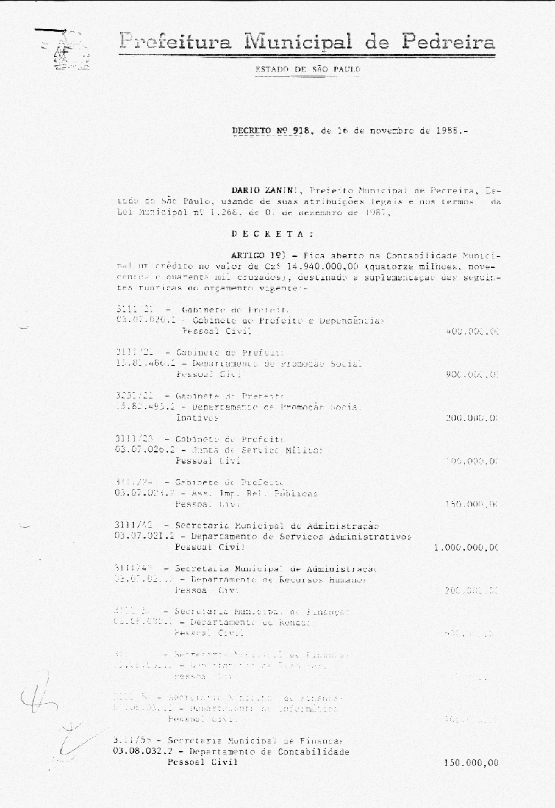 Ementa: Artigo 1° - Fica aberto na Contabilidade Municipal um crédito no valor de Cr$ 14.940.000,00 (quatorze milhões e novecentos e quarenta mil cruzeiros), destinados a suplementar as seguinte rubricas vigentes