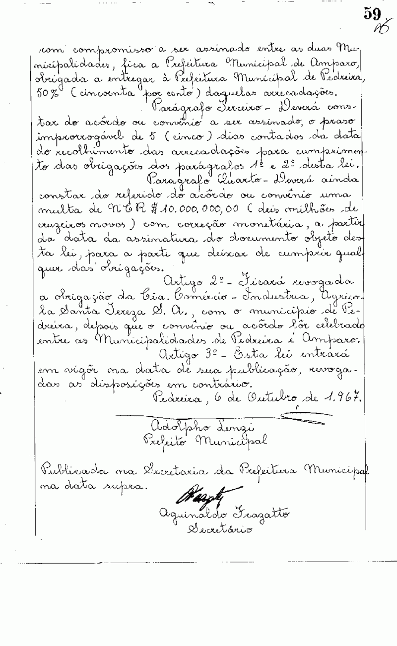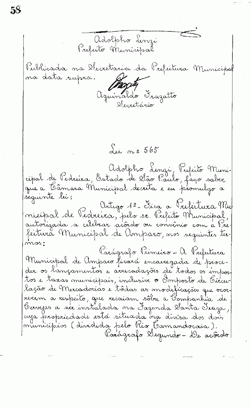 Ementa: Artigo 1º - Fica a Prefeitura Municipal de Pedreira, pelo snr. Prefeito Municipal, autorizada a celebrar acordo ou convênio com a Prefeitura Municipal de Amparo, nos seguintes termos.