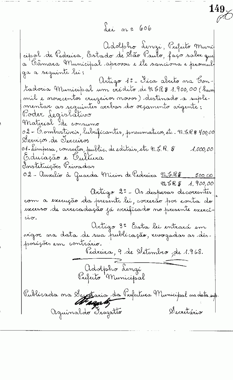 Lei Municipal - N° 606 de 09/09/1968