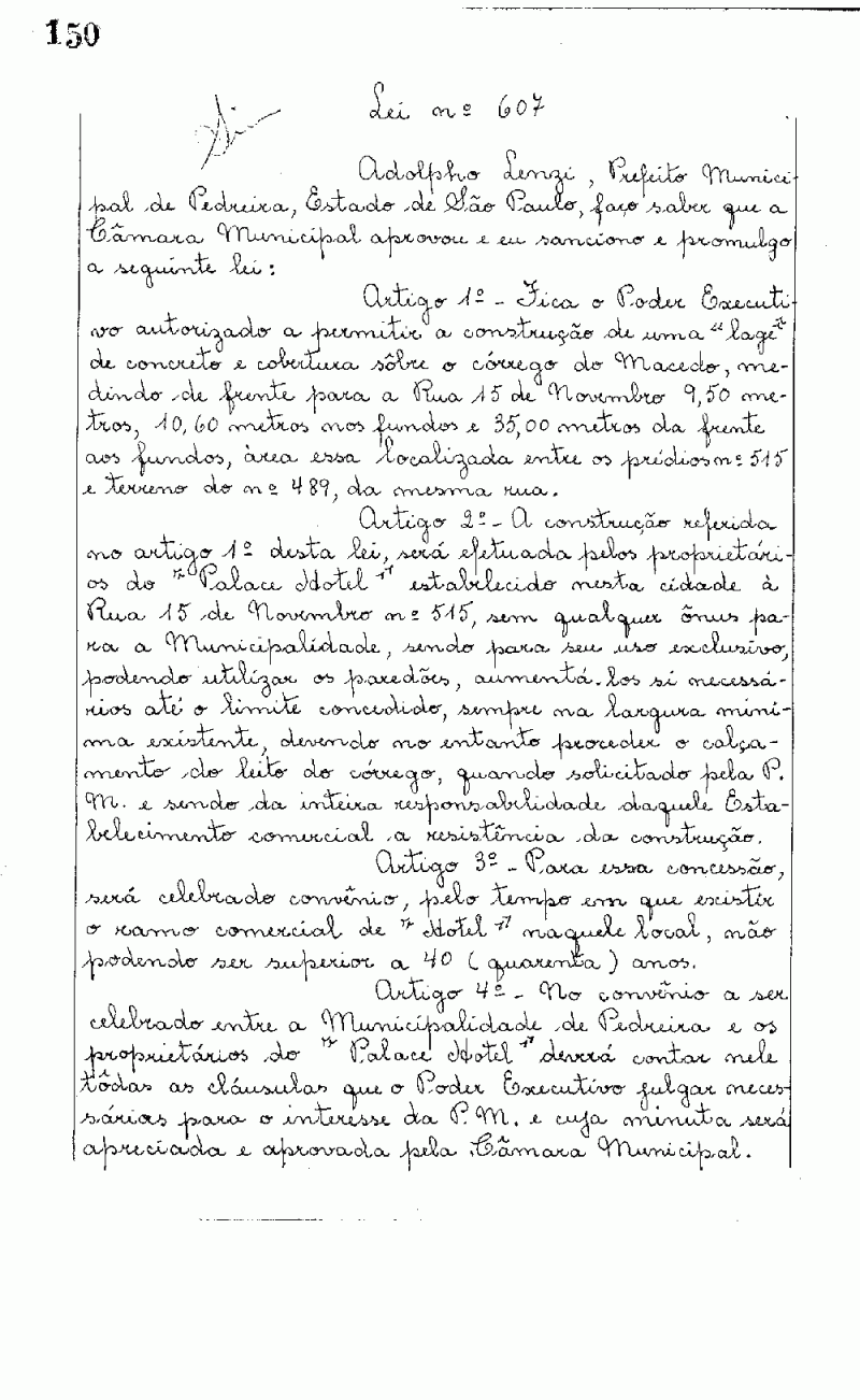 Ementa: Artigo 1º - Fica o Poder Executivo autorizado a permitir a construção de uma "laje" de concreto e cobertura sobre o córrego do Macedo, medindo da frente para a Rua 15 de Novembro 9,50 metros, 10,60 metros nos fundos e 35,00 metros da frente aos fundos, área essa localizada entre os prédios nº 515 e terreno do nº 489, da mesma rua.