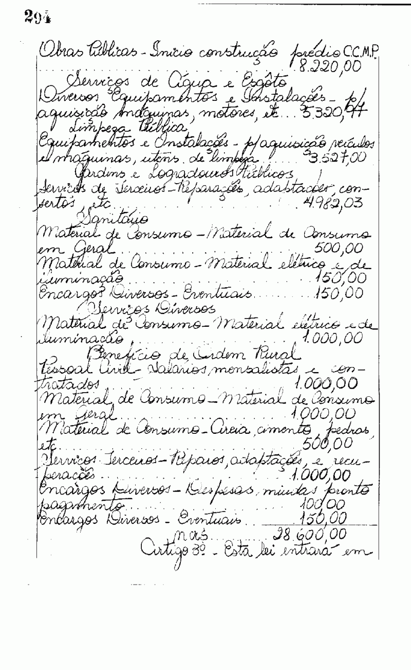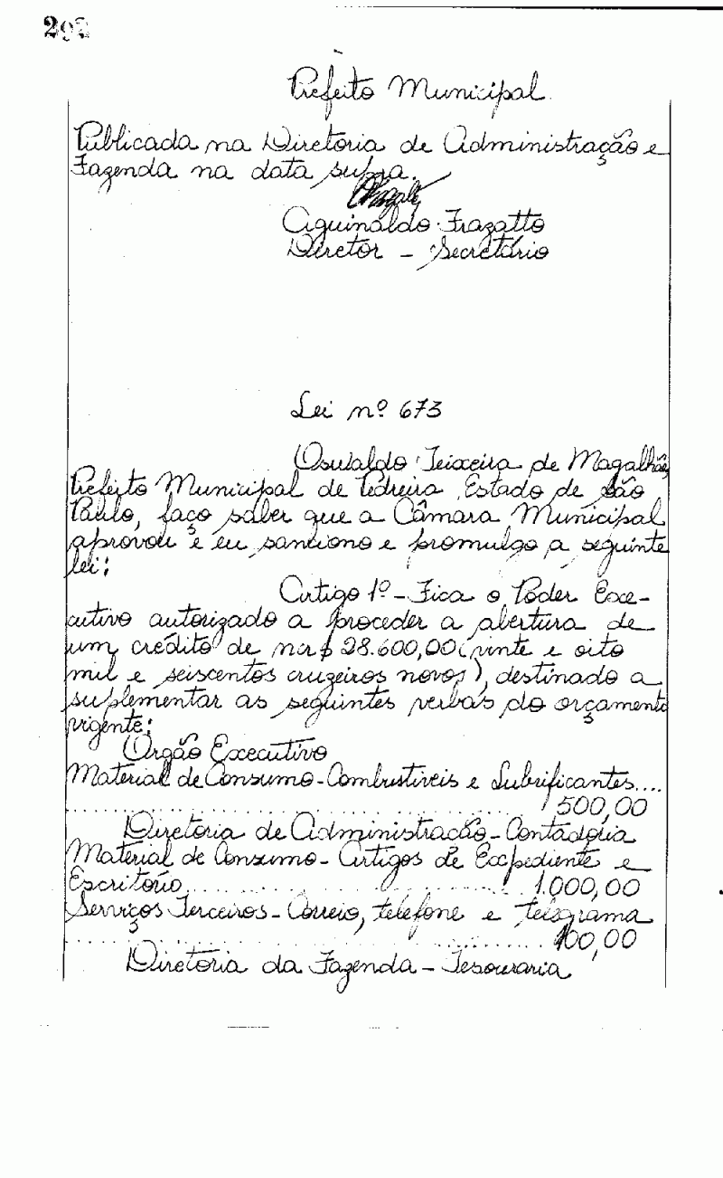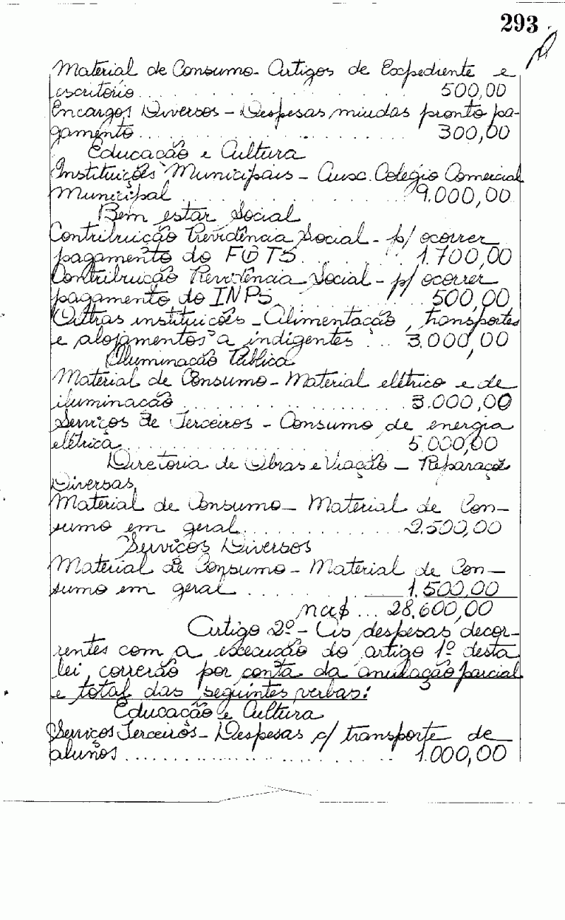 Ementa: Artigo 1º - Fica o Poder Executivo autorizado a proceder a abertura de um crédito de NCr$ 28.600,00 (vinte e oito mil e seiscentos cruzeiros novos), destinado a suplementar as seguintes verbas do orçamento vigente.