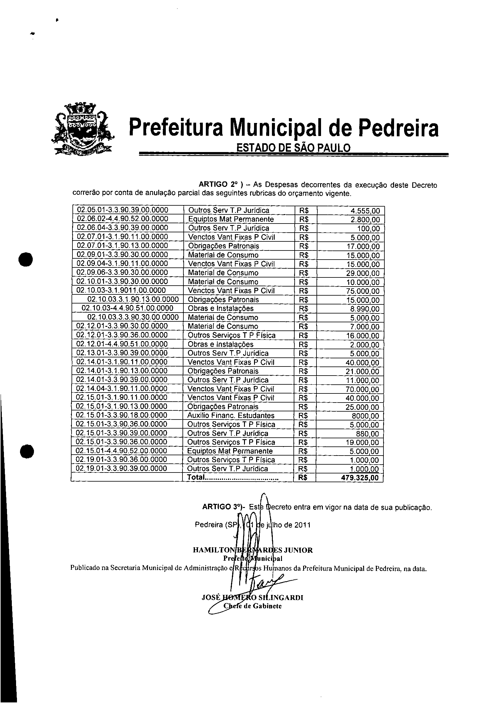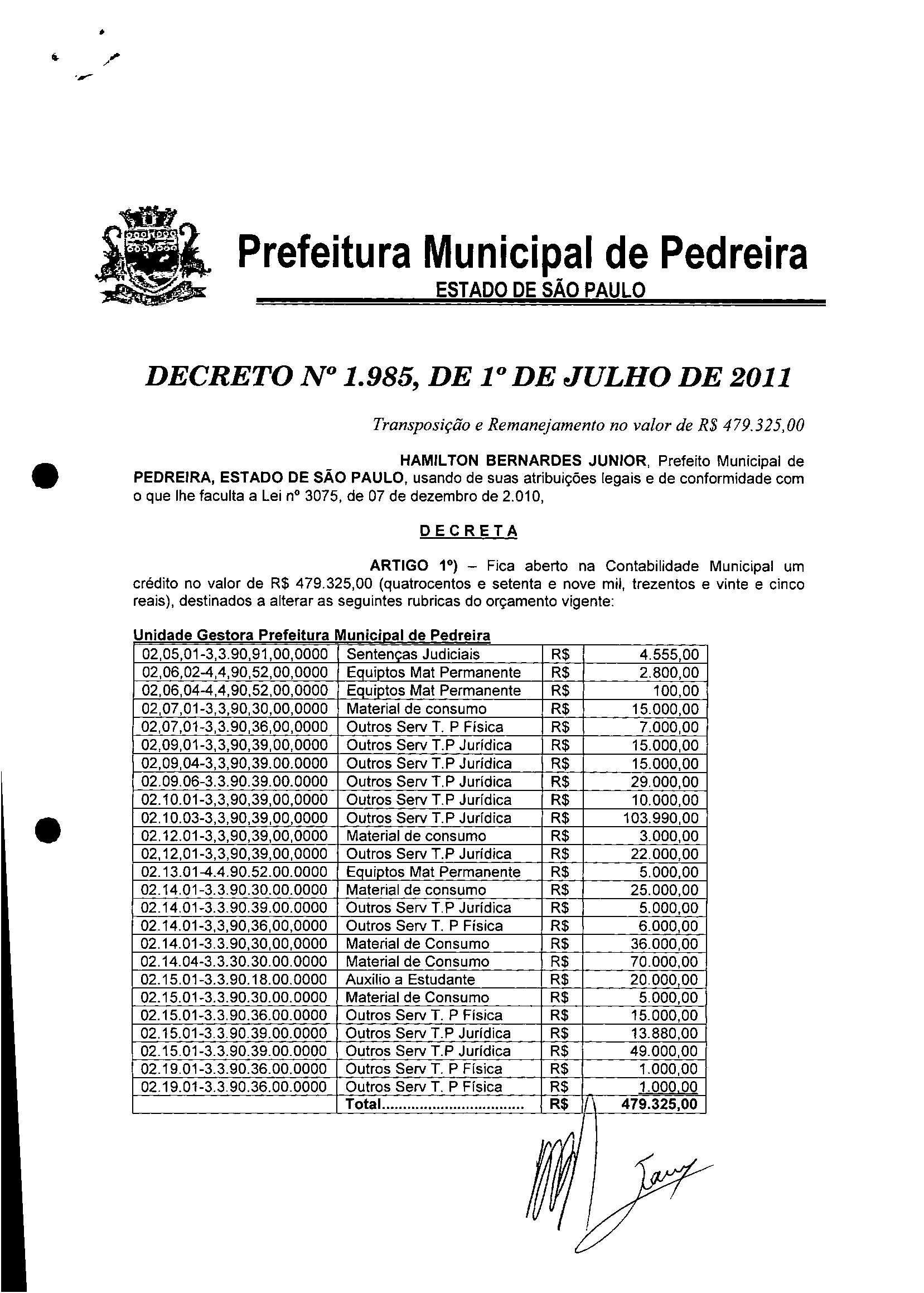Ementa: Transposição e Remanejamento no valor de R$ 479.325,00